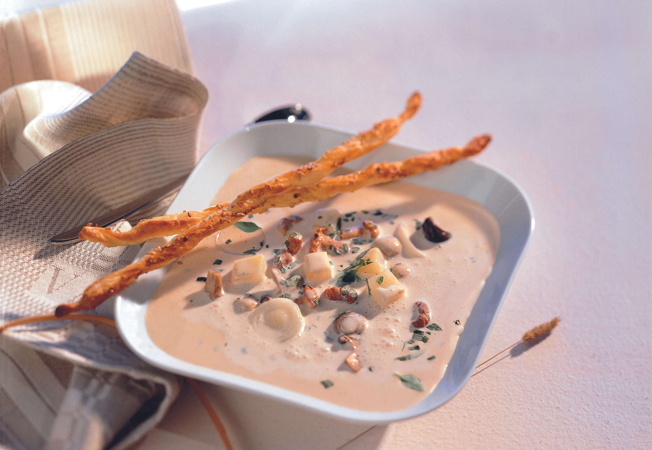 Erdäpfel-Schwammerlsuppe mit Sesamstangerln