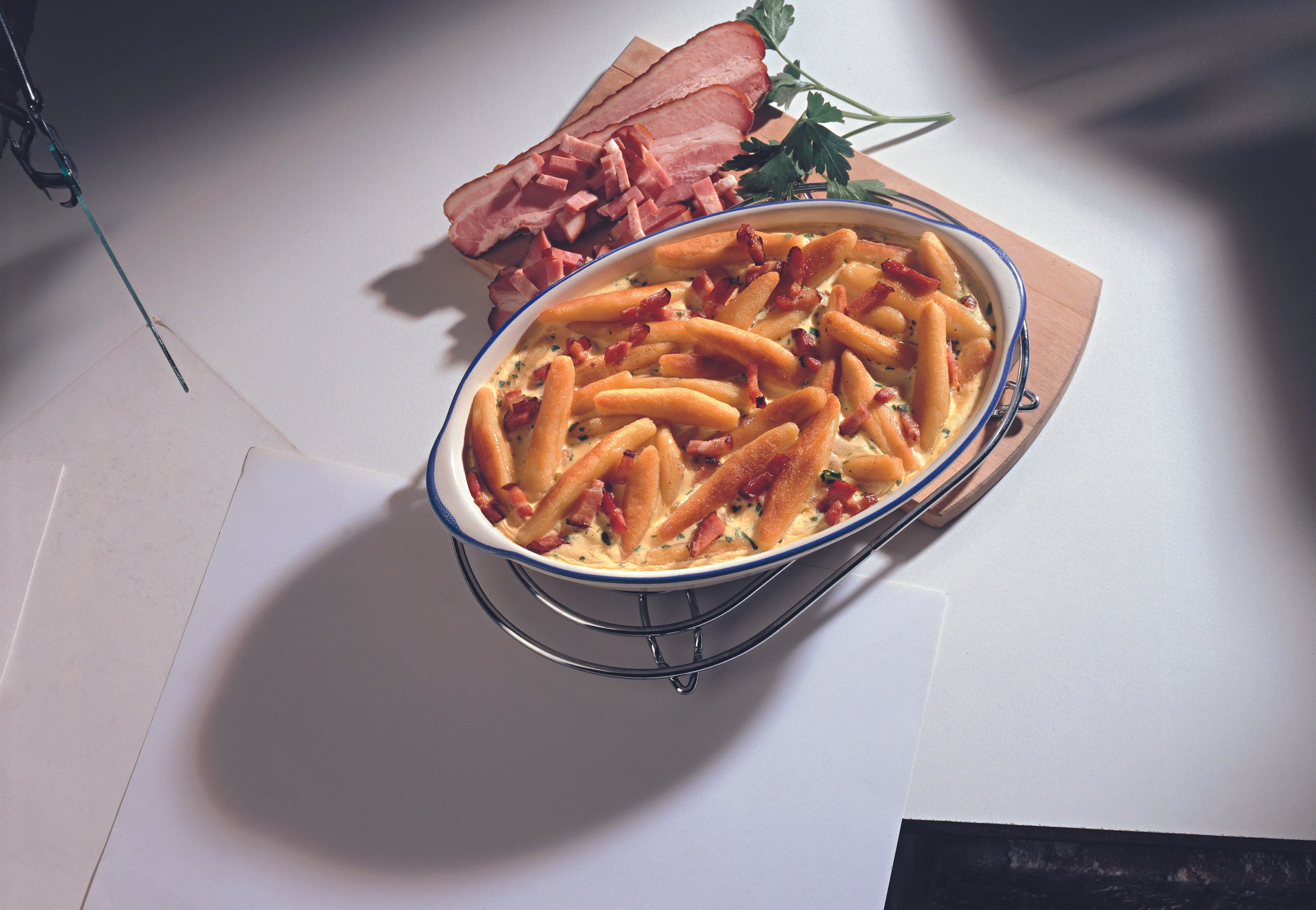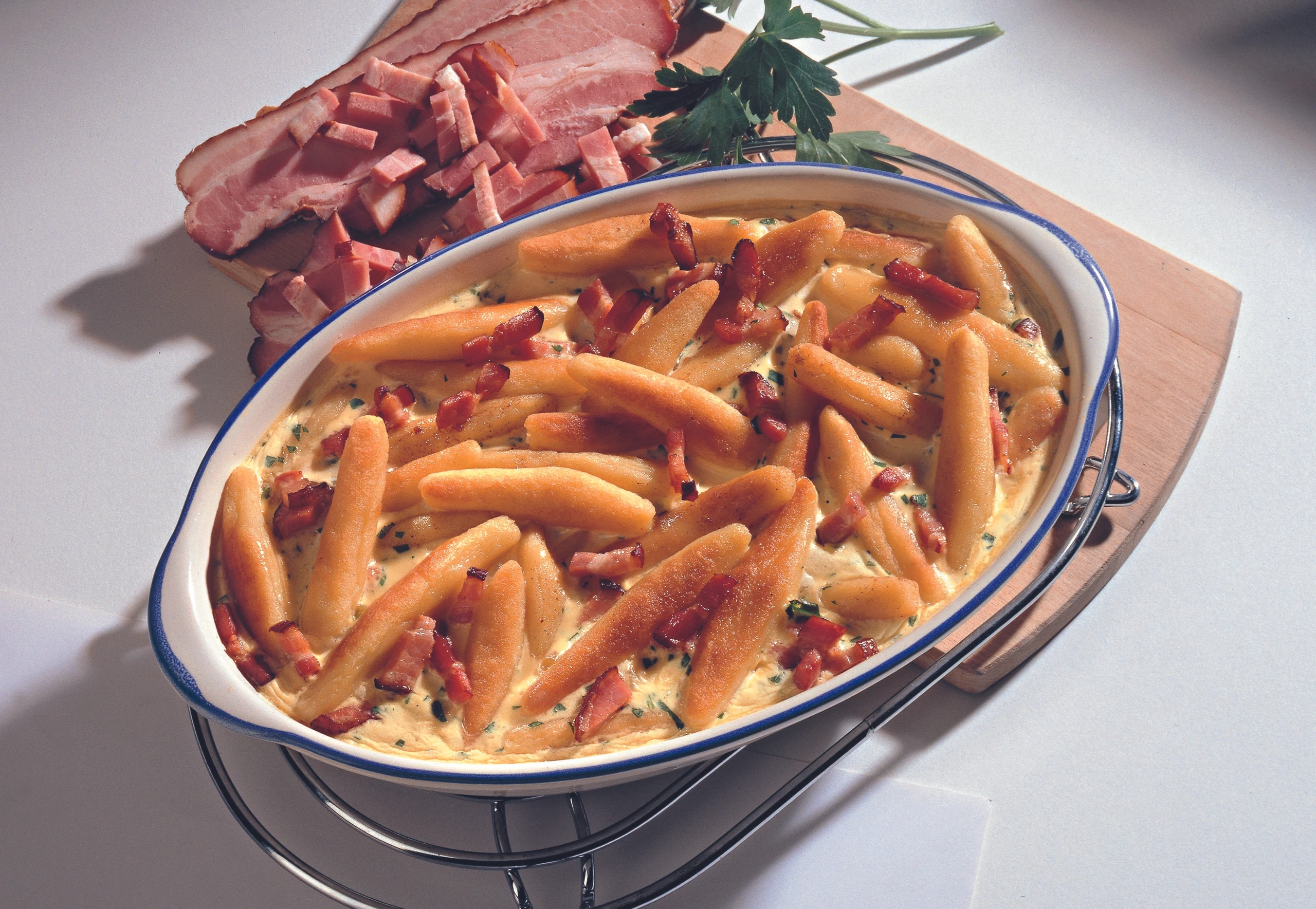 Nudeln in die Auflaufform schichten. Speck in 1/2 cm breite Streifen schneiden und in der Pfanne kurz anschwitzen. Nudeln mit Speckstreifen bestreuen, mit der Rahmmischung übergießen und im vorgeheizten Rohr (mittlere Schiene / Gitterrost) ca. 1/4 Stunde backen.