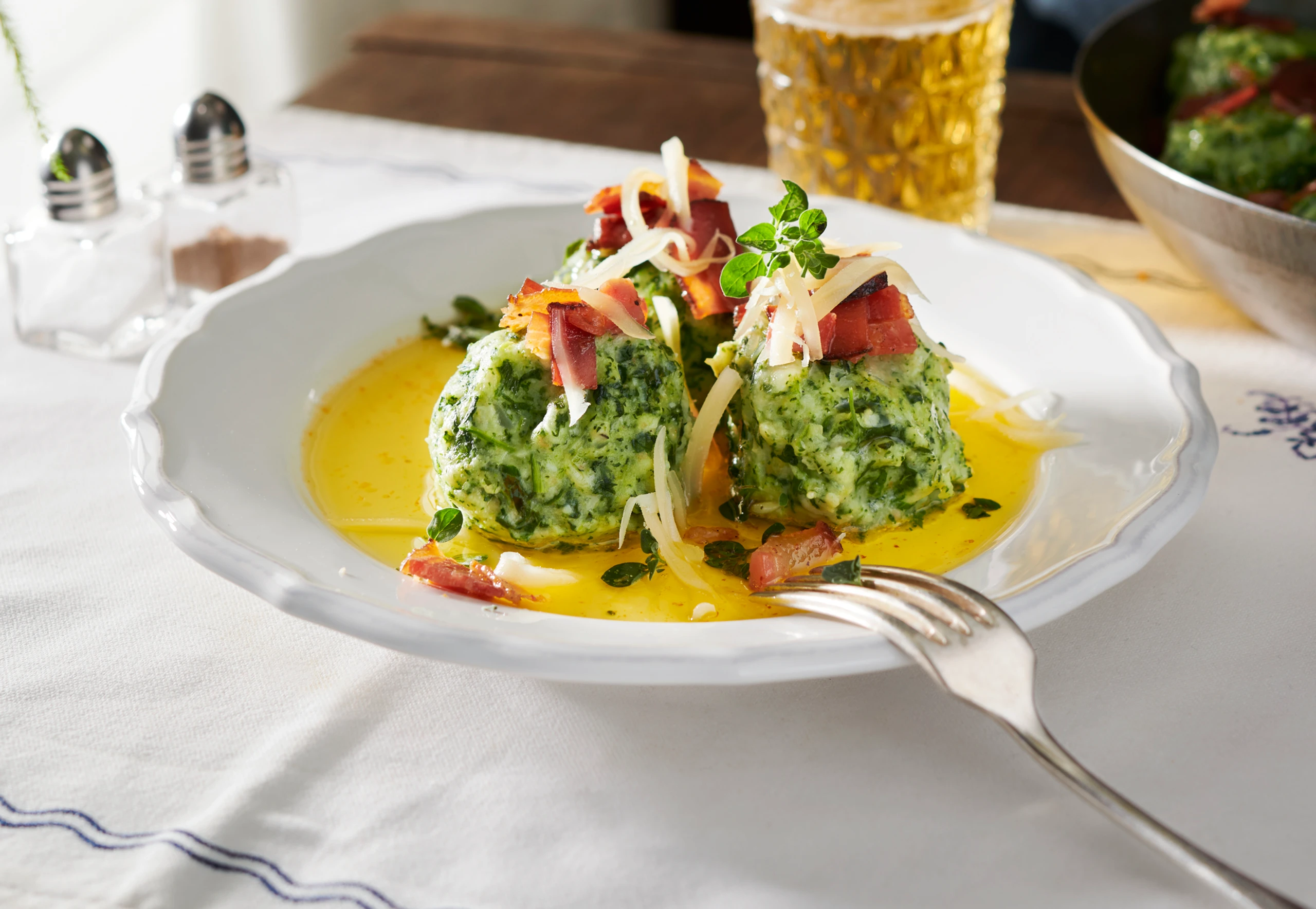 Erdäpfel-Spinatknödel mit Speck und Bergkäse