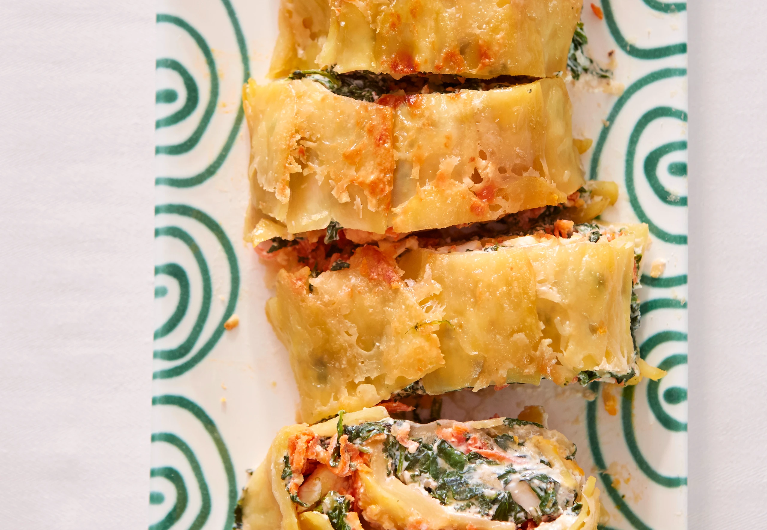 - Erdäpfelplatte aus dem Rohr nehmen, mit Ricottamasse bestreichen, mit Eiern bestreuen und eng einrollen. Strudel portionieren.