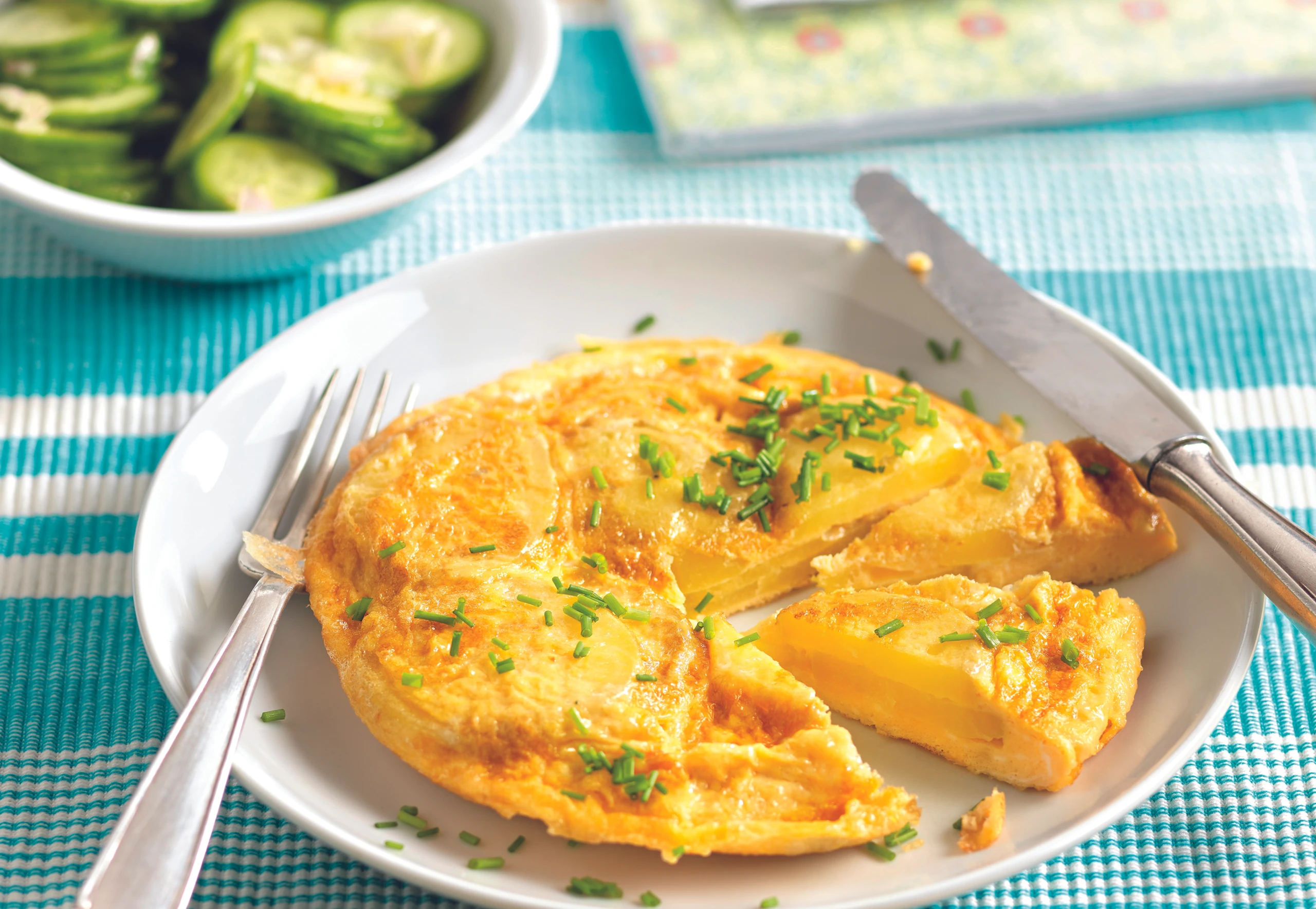 Pfanne mit einem großen flachen Teller bedecken, umdrehen und die Tortilla auf den Teller stürzen. 1 EL Olivenöl in der Pfanne erhitzen. Tortilla wieder in die Pfanne gleiten lassen. Noch einige Minuten braten, bis auch die zweite Seite schön goldbraun ist.