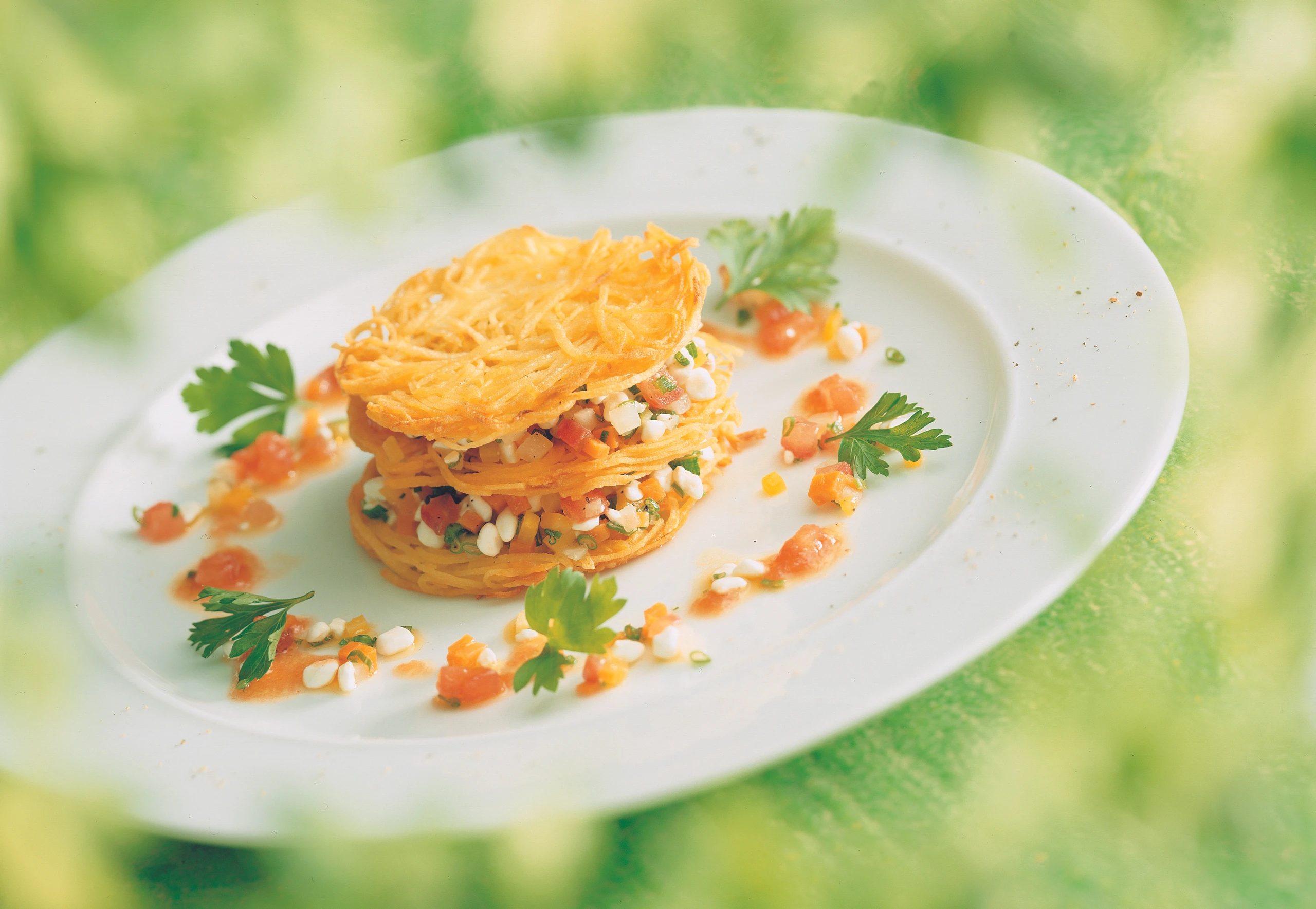 Ca. 3 EL von der Käsemischung für die Garnitur reservieren. Restliche Mischung auf 8 der Erdäpfelscheiben verteilen. Auf jedem Teller 2 gefüllte und eine ungefüllte Erdäpfelscheibe zu einem Türmchen übereinandersetzen. Die Erdäpfel-Türmchen mit der reservierten Gemüse-Käsemischung, der Marinade und mit Petersilblättchen garnieren und rasch servieren.