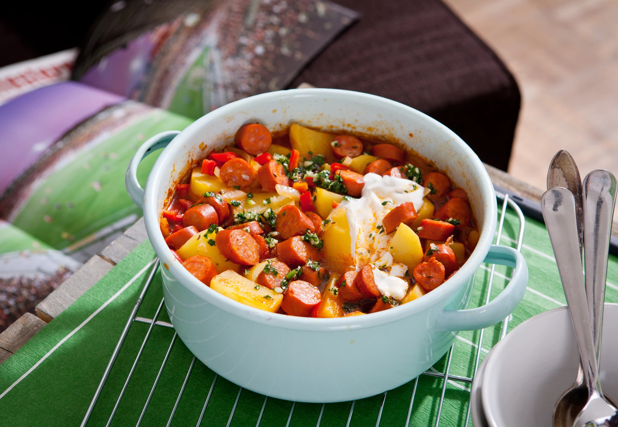 Debreziner in 1 cm dicke Scheiben schneiden, zu den Erdäpfeln geben und ca. 10 Minuten mitgaren. Mit gehackter Petersilie und Sauerrahm garniert servieren.