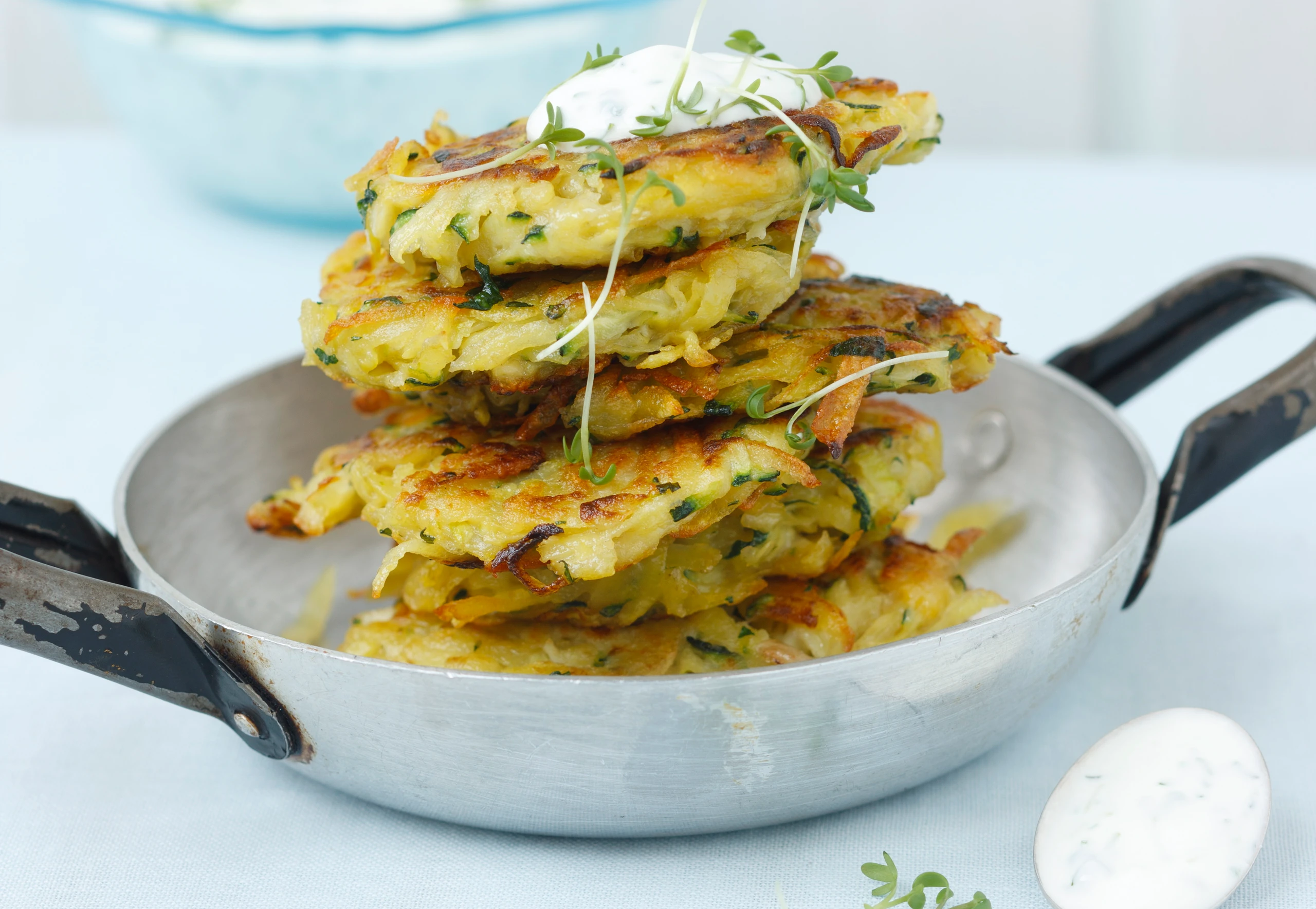 Erdäpfel schälen. Zucchini putzen. Erdäpfel und Zucchini grob raspeln und gut ausdrücken. Dotter, Mehl und Kräuter untermischen, Masse mit Salz, Pfeffer und zerdrücktem Knoblauch würzen.