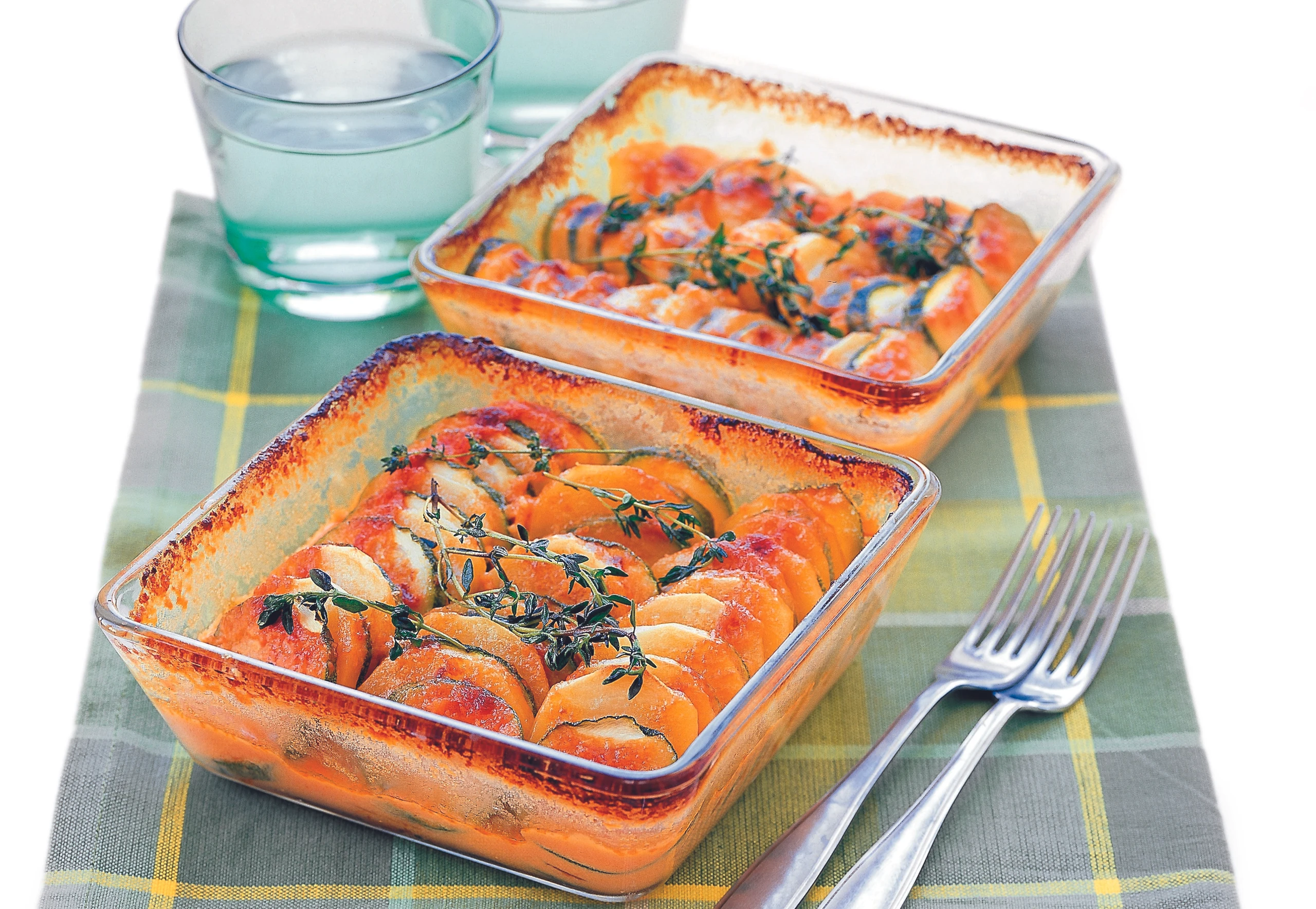 Backrohr auf 180 °C vorheizen. Zwei kleine oder eine größere Auflaufform mit Butter ausstreichen und mit 1 zerdrückten Knoblauchzehe ausstreichen.