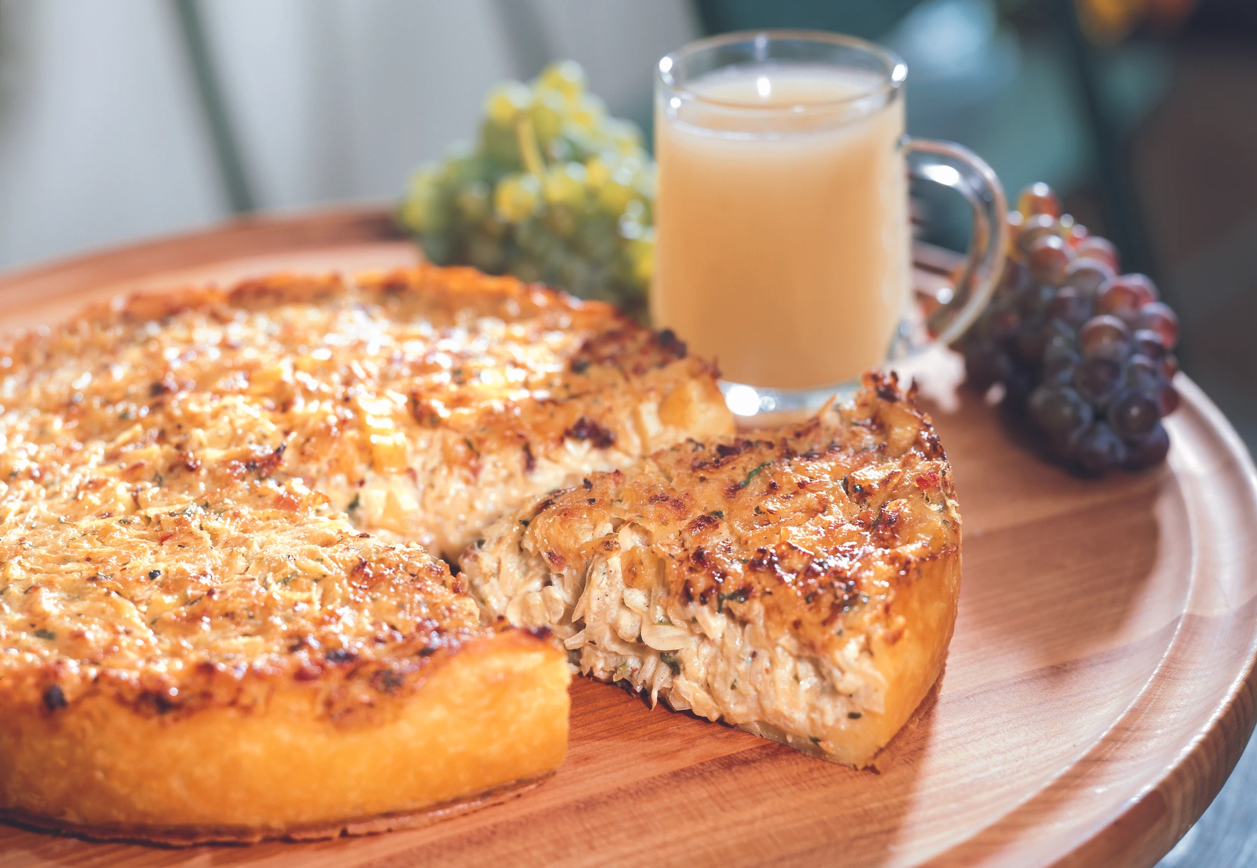 Crème fraîche und Dotter verrühren, zusammen mit der gehackten Petersilie unter die Zwiebel-Erdäpfelmasse mischen. Masse in die ausgekleidete Form füllen und im Rohr ca. 1 Stunde goldgelb backen.