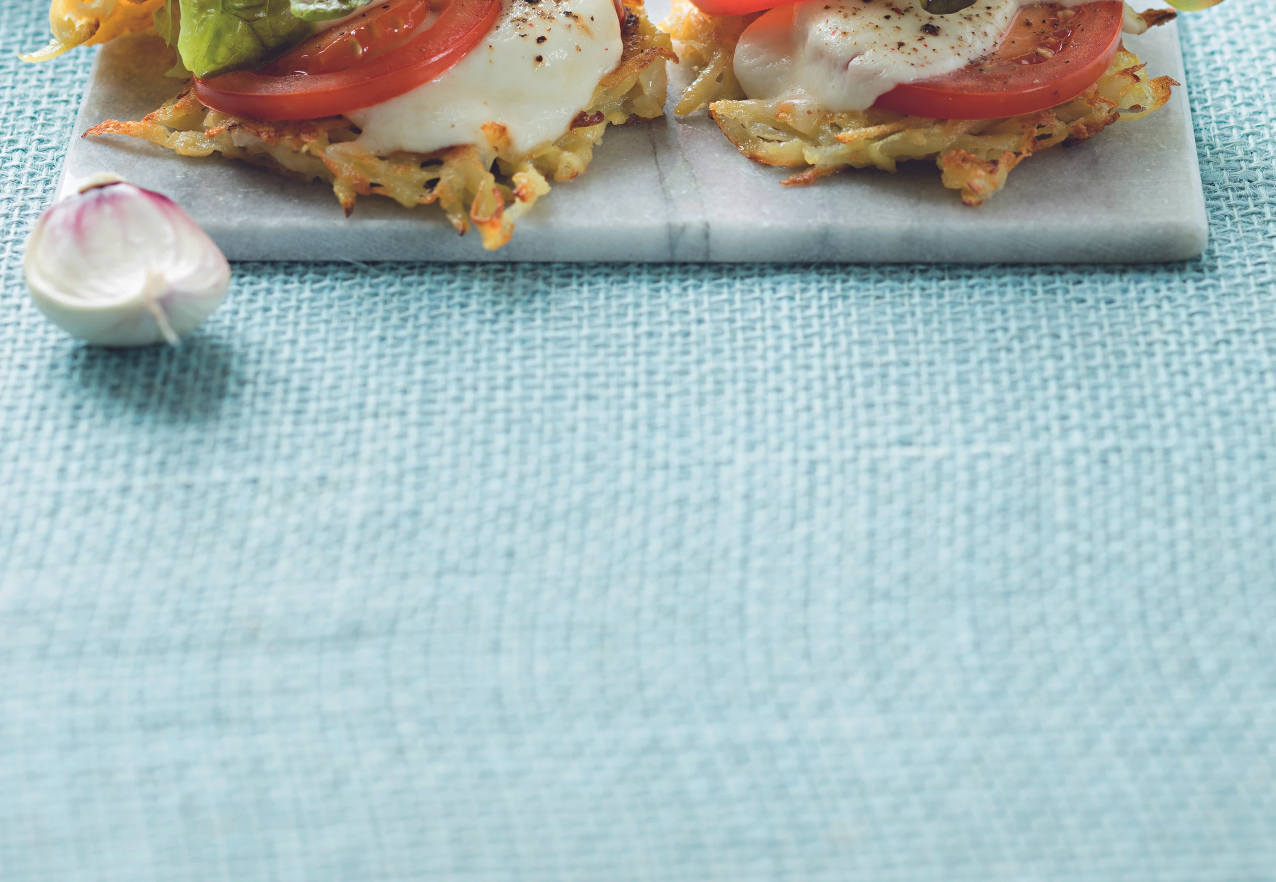 Caprese-Erdäpfelburger mit Mozzarella und Paradeisern