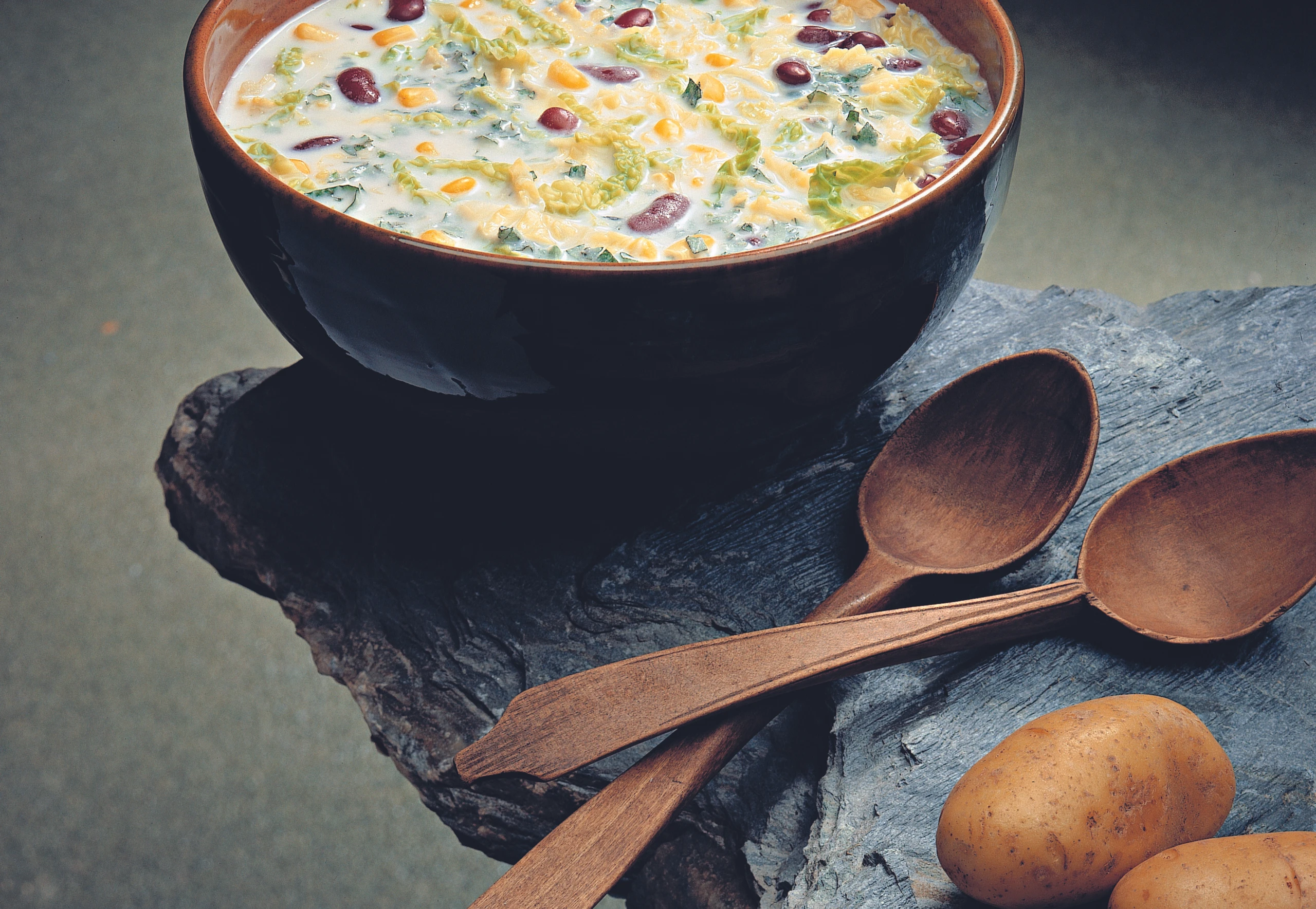 Erdäpfelcremesuppe mit Kohl, Mais und Bohnen