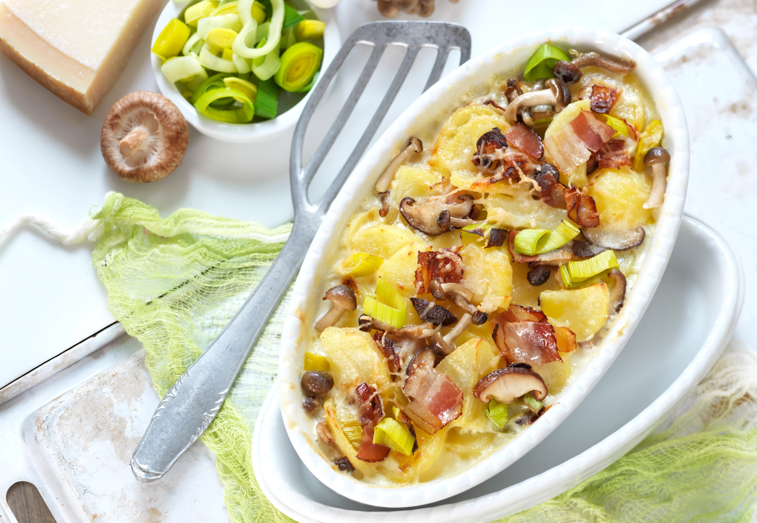 Erdäpfelgratin mit Pilzen, Lauch und Speck