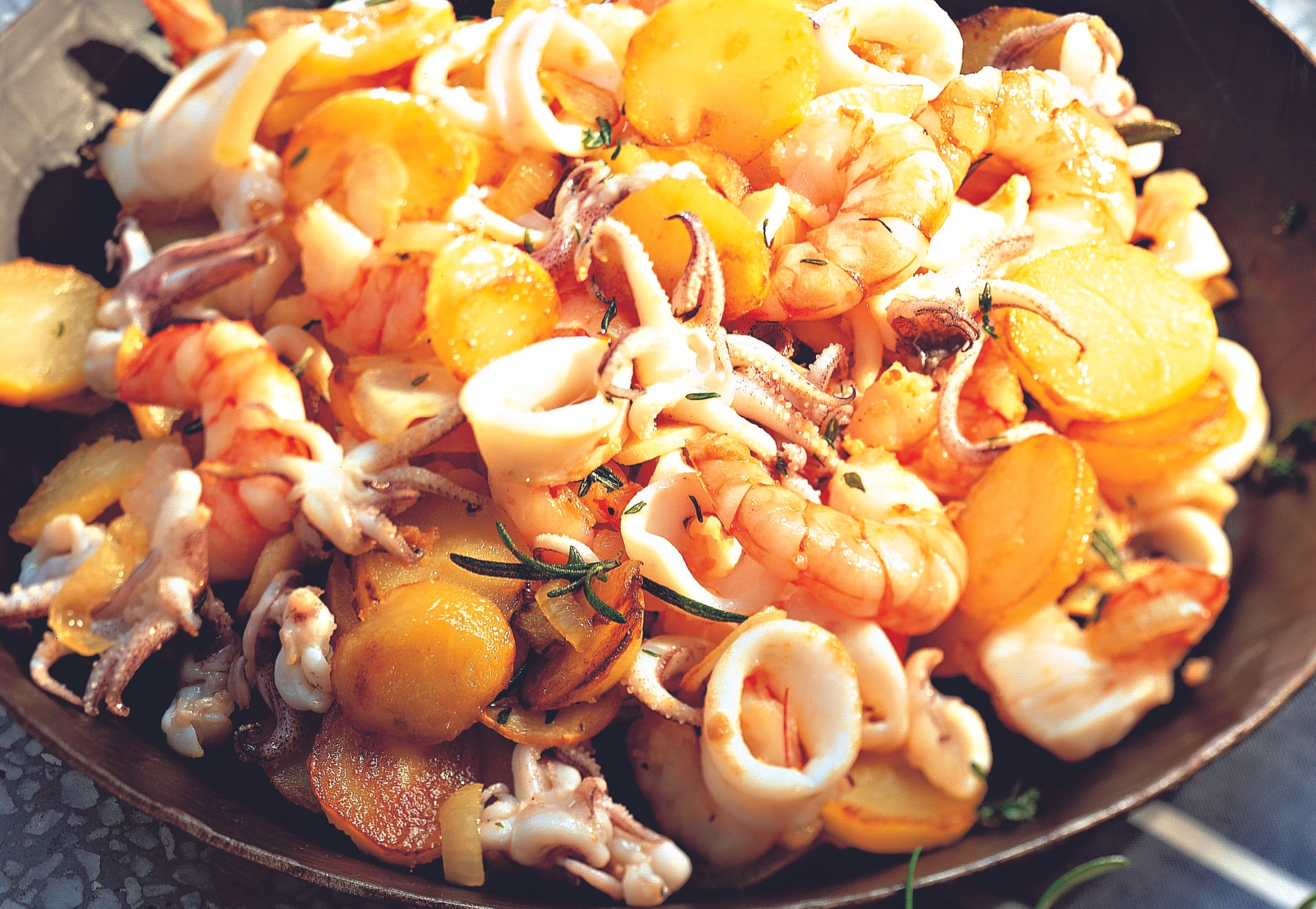 Im Bratrückstand übriges Öl erhitzen, Tintenfisch darin scharf anbraten. Zwiebel, Knoblauch, Shrimps und Kräuter unterrühren, kurz mitrösten, salzen und pfeffern. Erdäpfel untermischen. Dazu passt Salat.