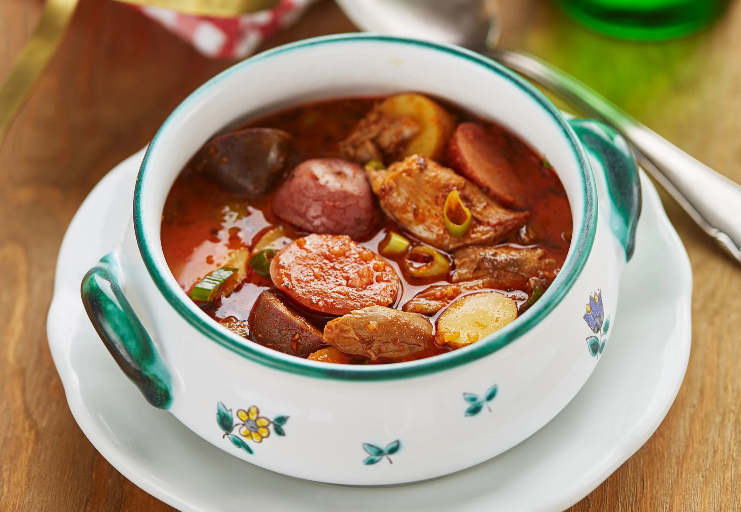 Ca. 15 Minuten vor Ende der Garzeit Entenfleisch zugeben und mitgaren. Gulasch anrichten und mit Jungzwiebeln bestreut servieren.