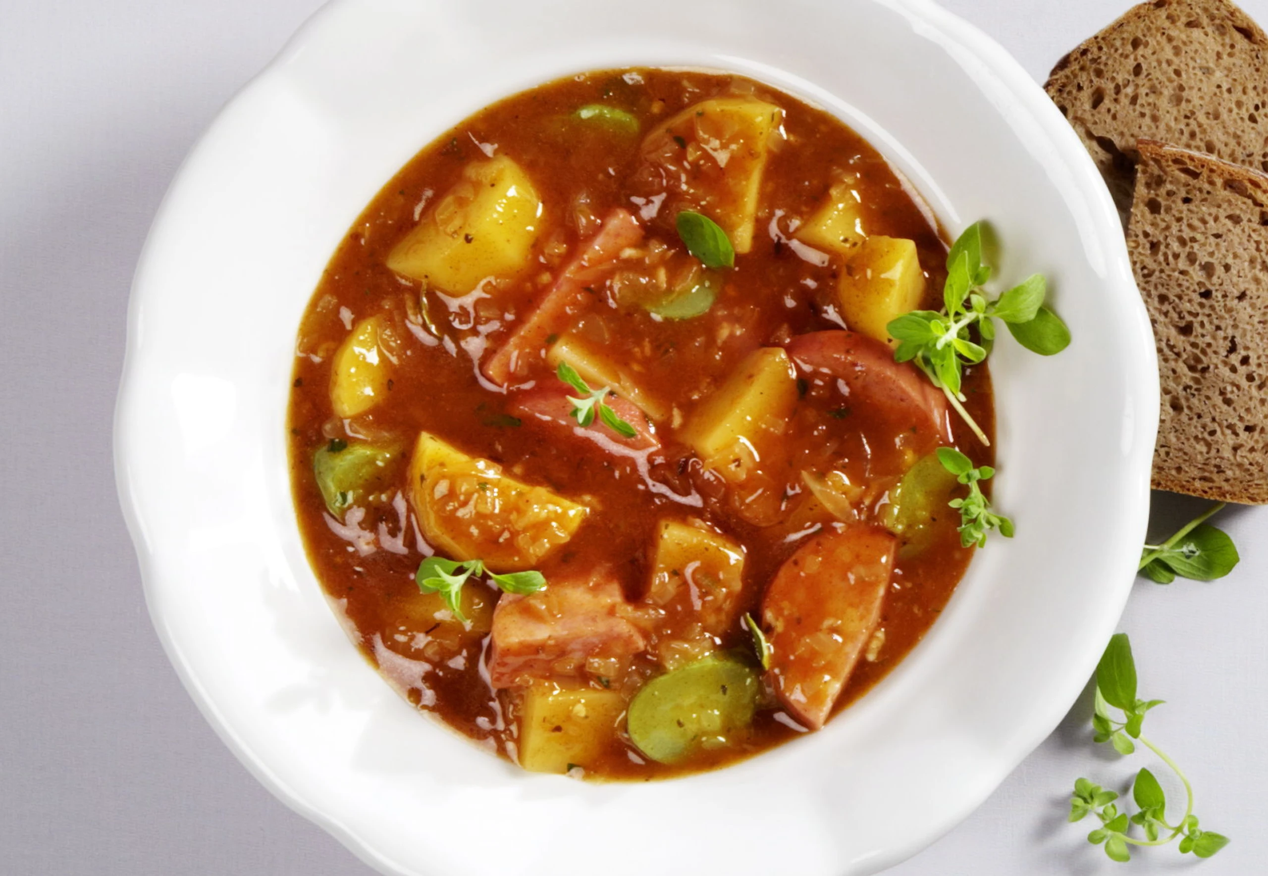 Zwiebeln im Öl goldgelb rösten, Paprika einrühren und mit Essig ablöschen. Suppe zugießen, Erdäpfel und 2 Lorbeerblätter zugeben. Gulasch mit Salz, Pfeffer, 2 TL Majoran, 1 TL Kümmel und zerdrücktem Knoblauch würzen und ca. 30 Minuten köcheln.