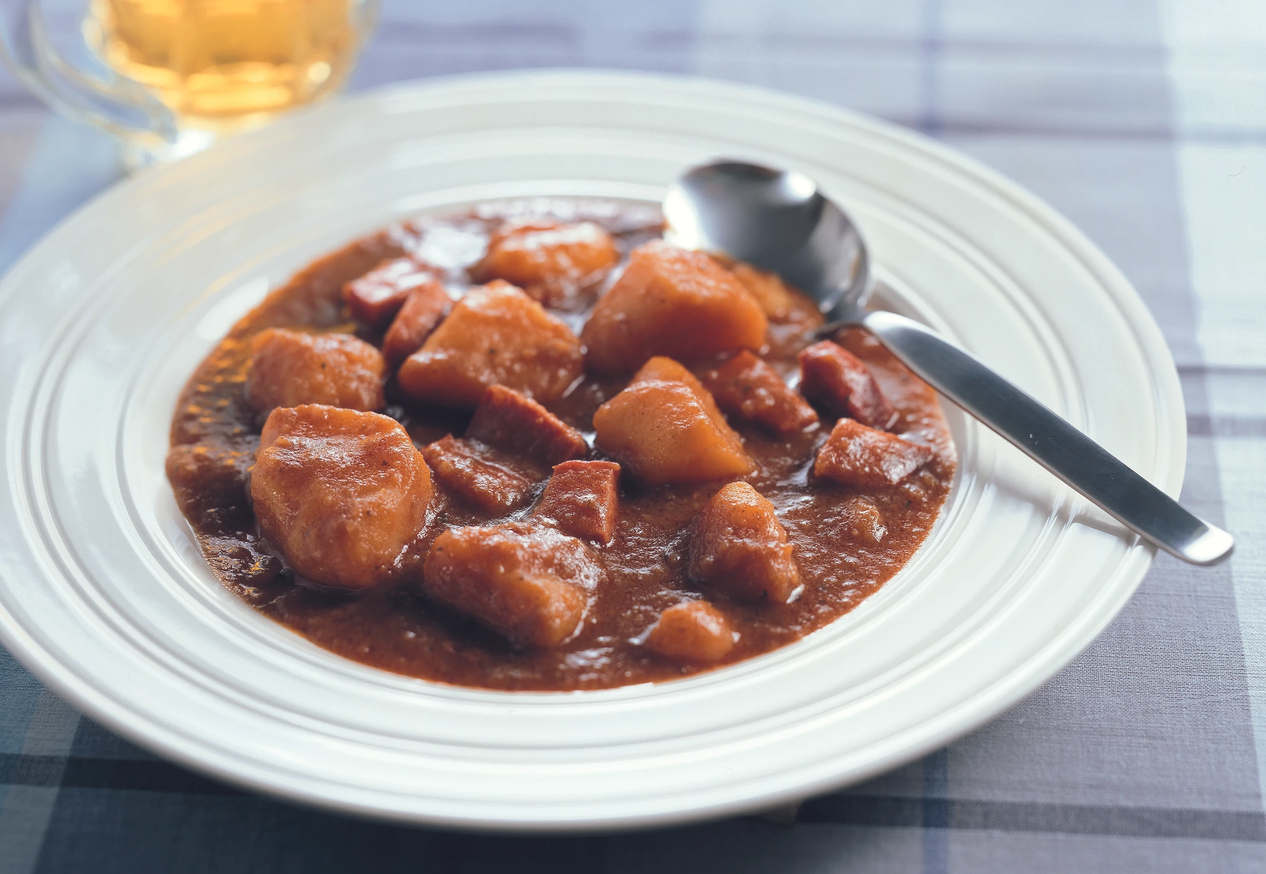 - Am Ende der Garzeit Erdäpfel unter den Gulaschsaft mischen und ca. 15 Minuten mitköcheln. Wurst einrühren und das Gulasch so lange weiterköcheln, bis die Erdäpfel weich sind. Sauerrahm mit Mehl und 1 EL Wasser verquirlen und das Gulasch damit binden. Gulasch noch kurz köcheln.