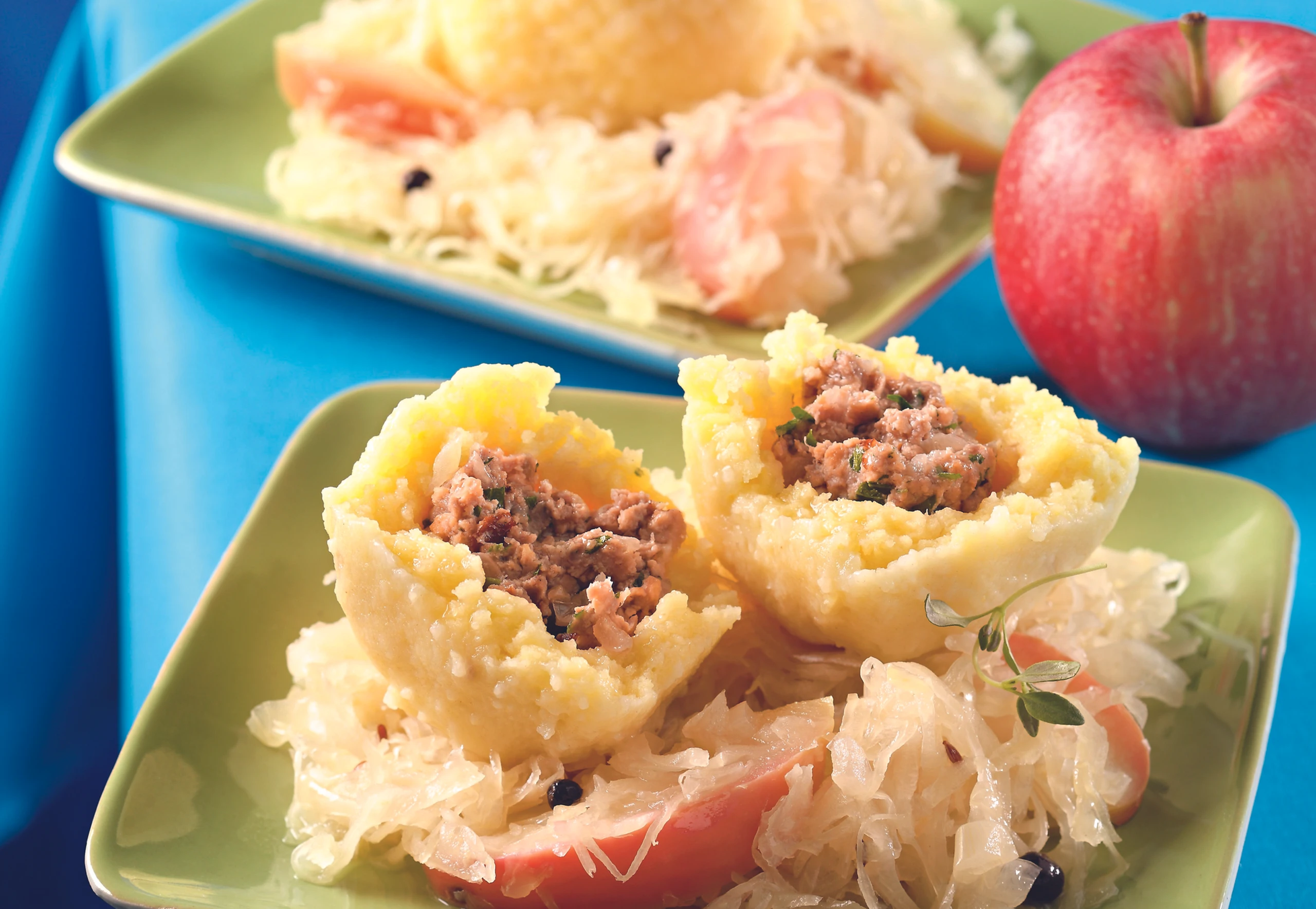 Reichlich Salzwasser aufkochen, Knödel in mehreren Arbeitsschritten im leicht kochenden Wasser garziehen lassen (12 Minuten). Knödel herausheben, abtropfen lassen und auf dem Sauerkraut anrichten.