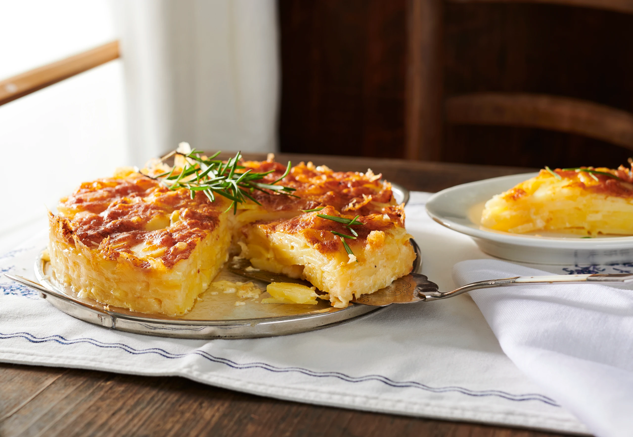 Rohr auf 160°C vorheizen. Springform (Ø 26 cm) mit Butter ausstreichen und auf ein Blech stellen. Erdäpfel schälen und in dünne Scheiben schneiden. Boden der Form überlappend mit Erdäpfelscheiben auslegen. Etwas vom Käse darüber streuen und mit einer Schicht Erdäpfel bedecken. So fortfahren, bis alle Zutaten eingeschichtet sind. Mit einer Schicht Käse abschließen.