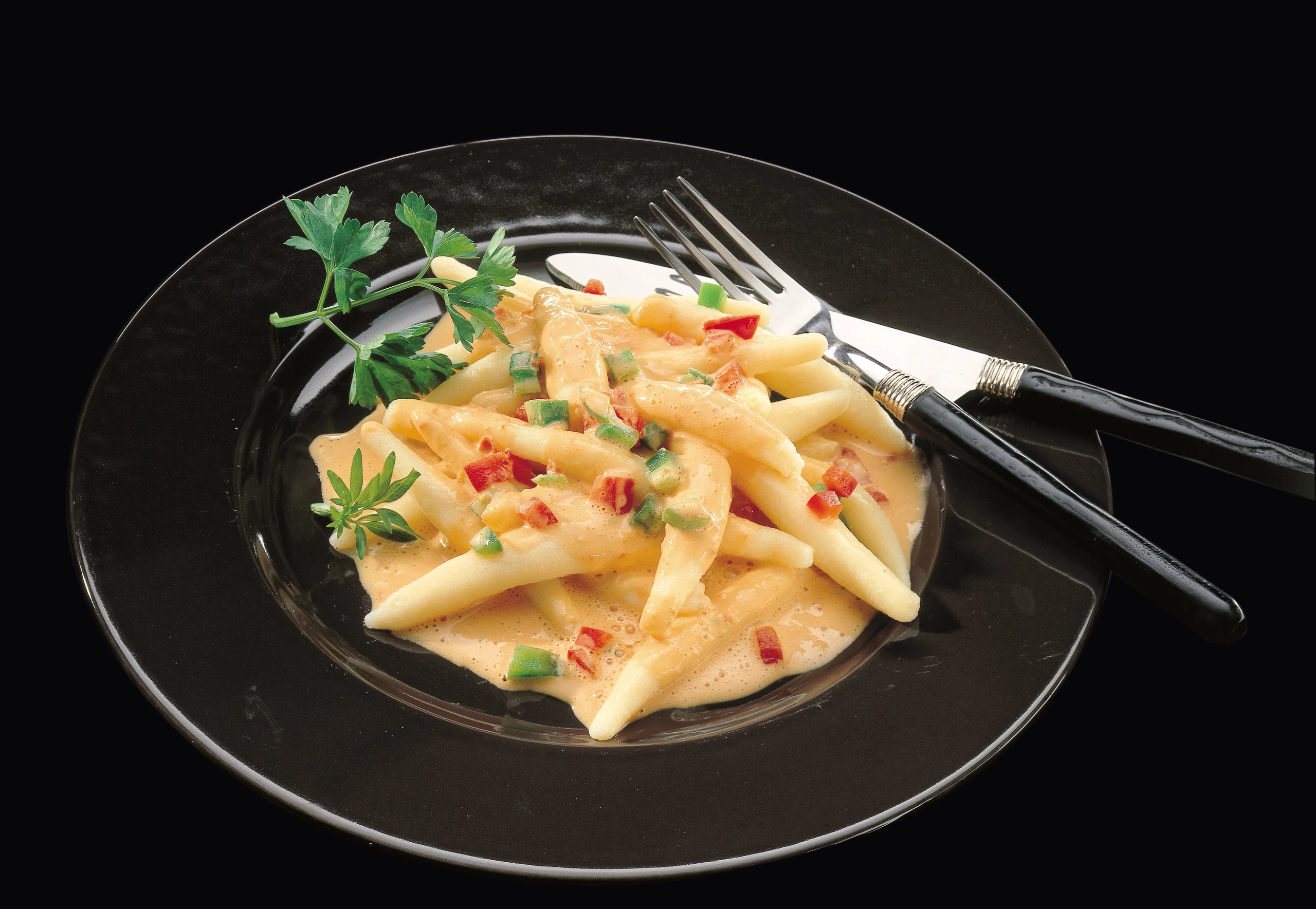 Parallel dazu Salzwasser aufkochen. Erdäpfelnudeln einlegen, aufkochen und auf kleiner Flamme 5 Minuten köcheln. Hitze reduzieren und weitere 5 Minuten ziehen lassen. Nudeln mit einem Siebschöpfer herausheben, gut abtropfen lassen und mit der Sauce vermischt anrichten.