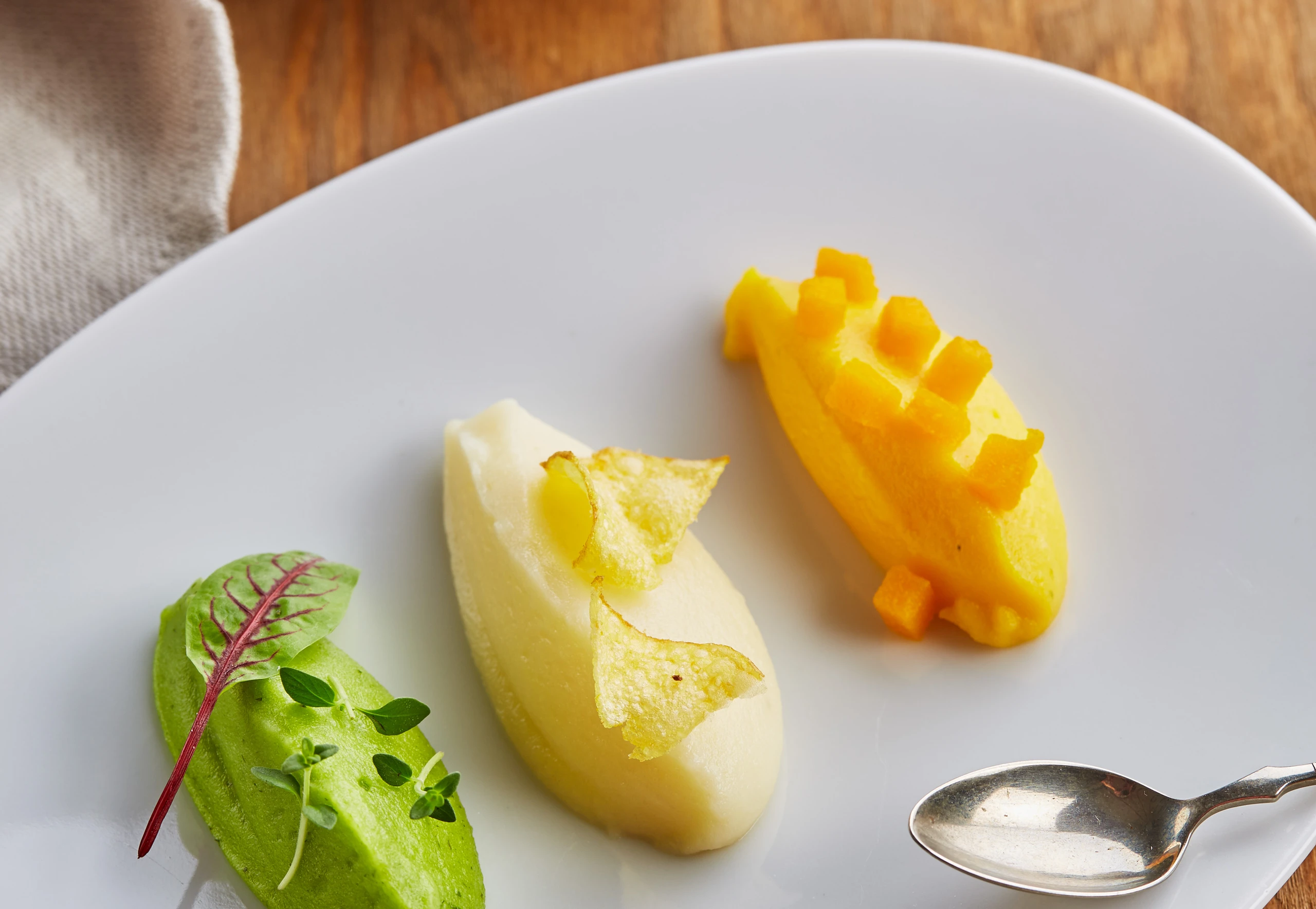 Dreierlei Püree: Erdäpfelpüree mit Kürbis und Spinat
