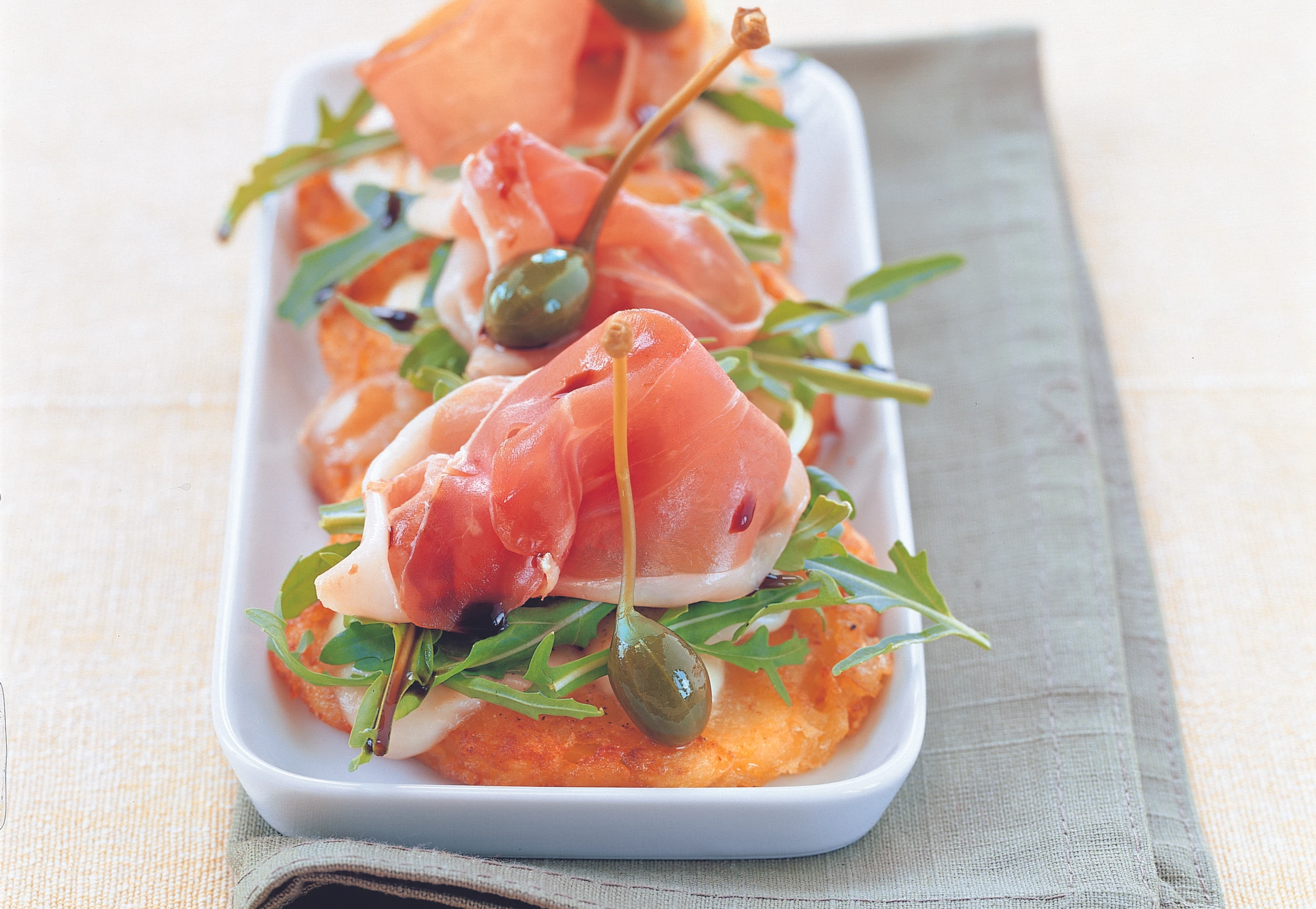 Erdäpfelpuffer mit Rucola und Rohschinken