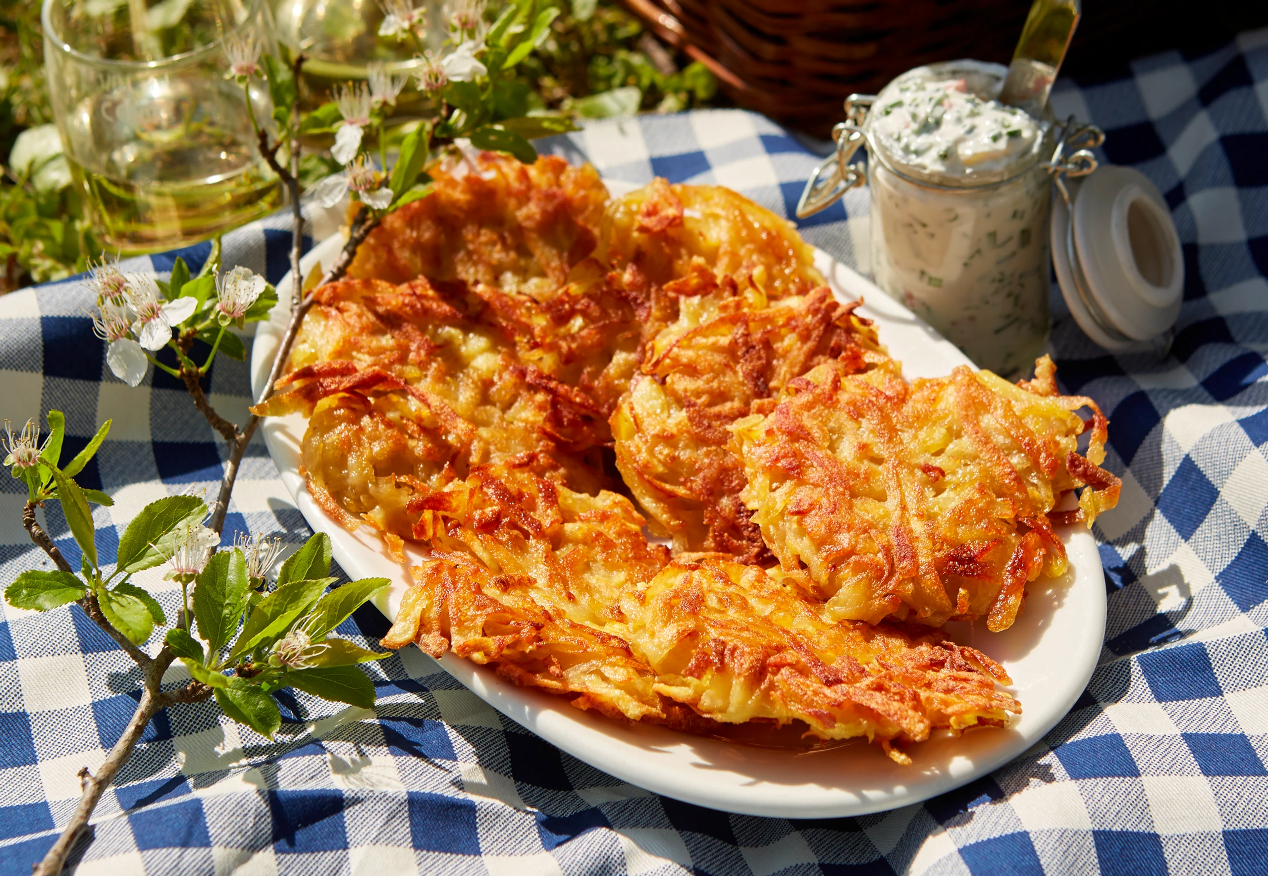 Aus der übrigen Masse in zwei weiteren Arbeitsgängen restliche Puffer braten. Puffer und Dip getrennt in gut verschließbare Gefäße füllen.