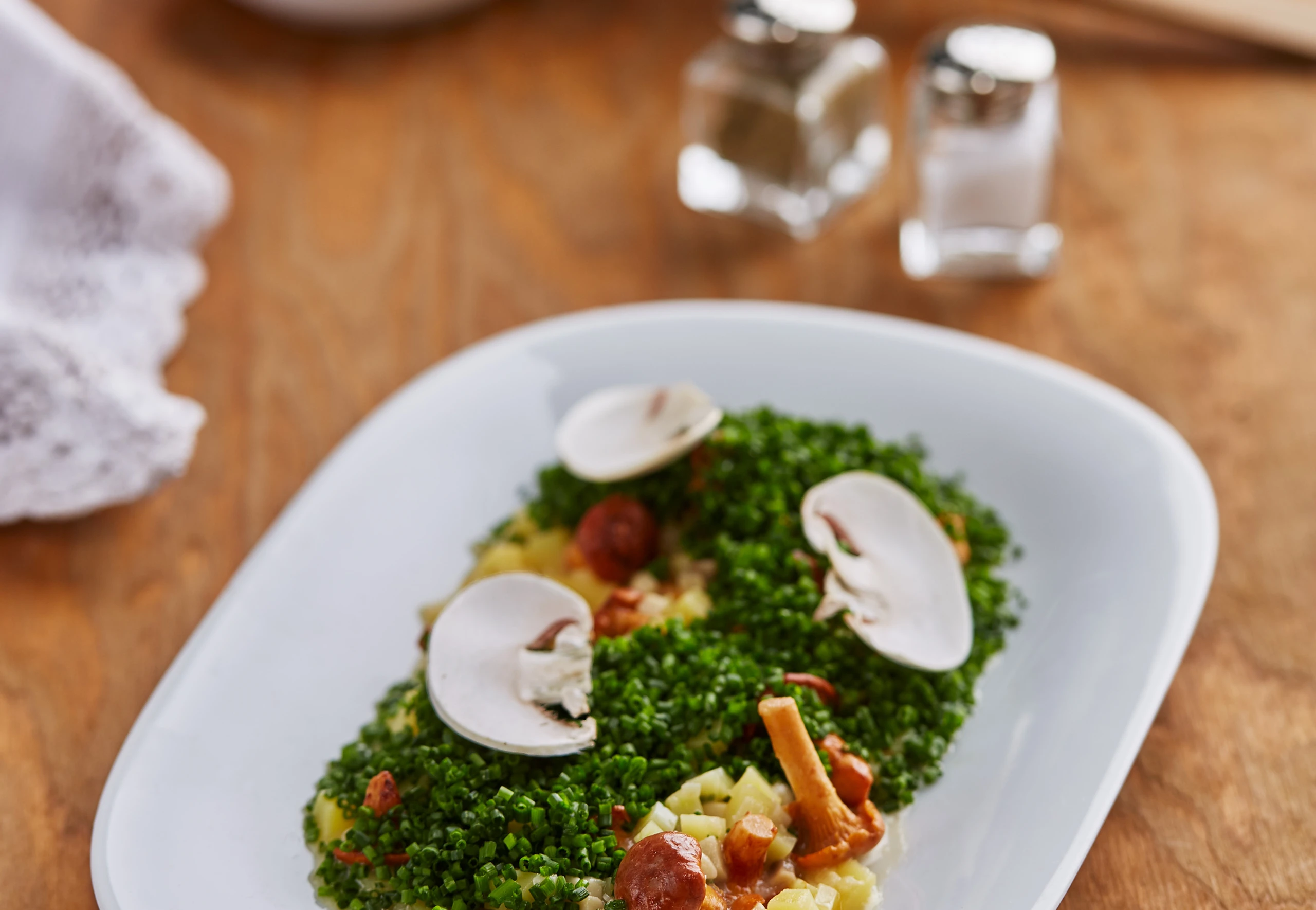 Champignons putzen. Für die Garnitur einen Champignon in dünne Scheiben schneiden und beiseite legen. Erdäpfel schälen. Erdäpfel und übrige Champignons in 0,5 cm große Stücke schneiden. Schwammerln putzen, eventuell halbieren oder vierteln. Schnittlauch fein schneiden.