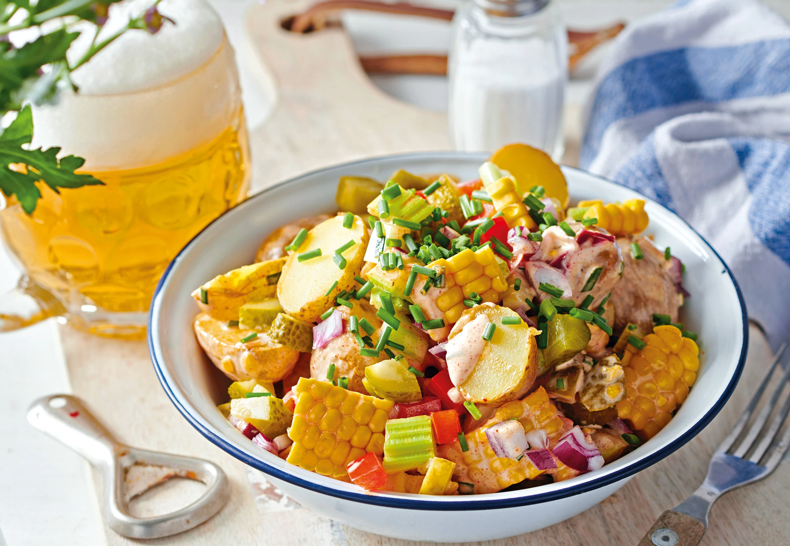 Erdäpfelsalat mit Maiskolben und Essiggurkerln