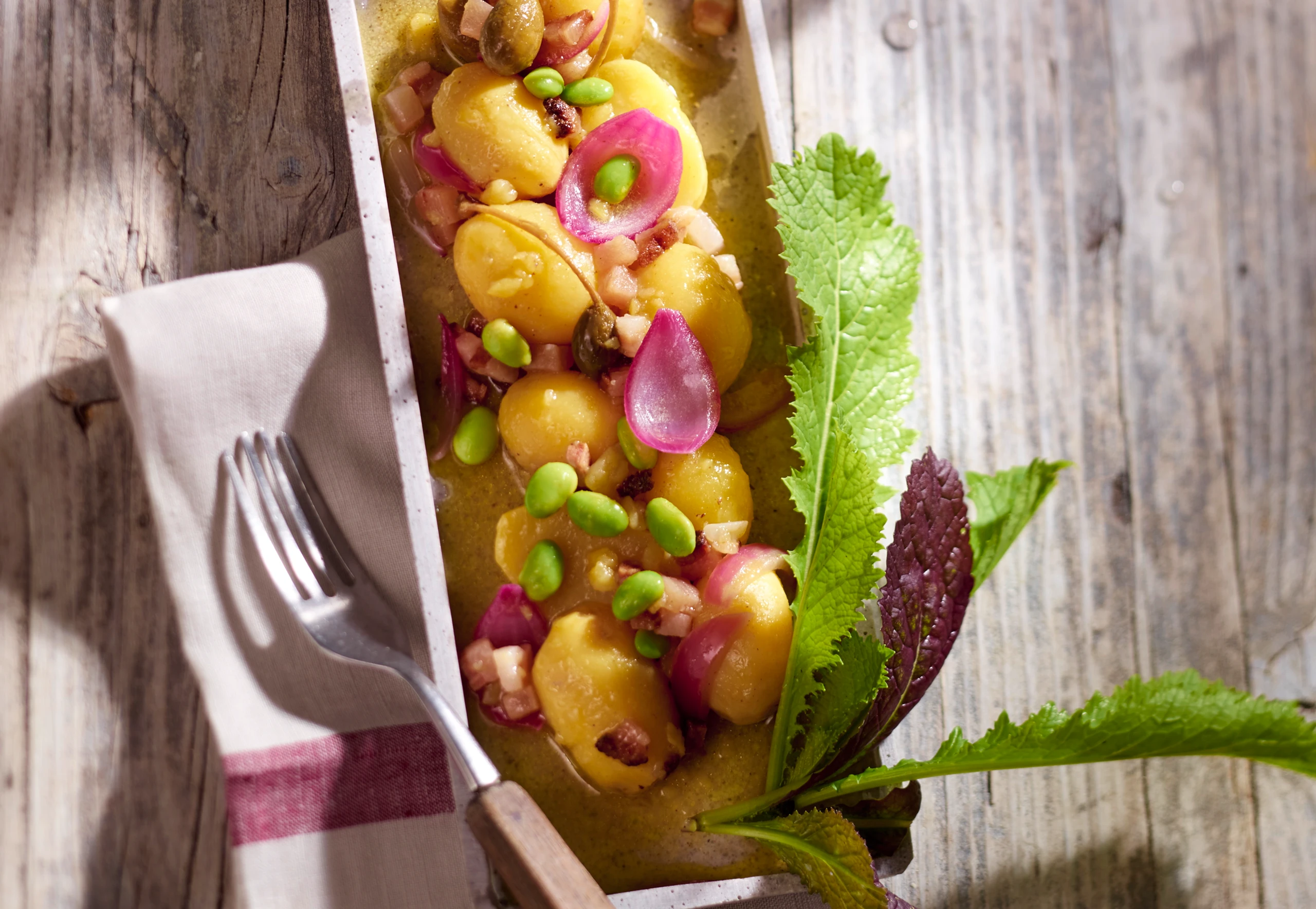 Erdäpfelsalat mit Speck und Sojabohnen