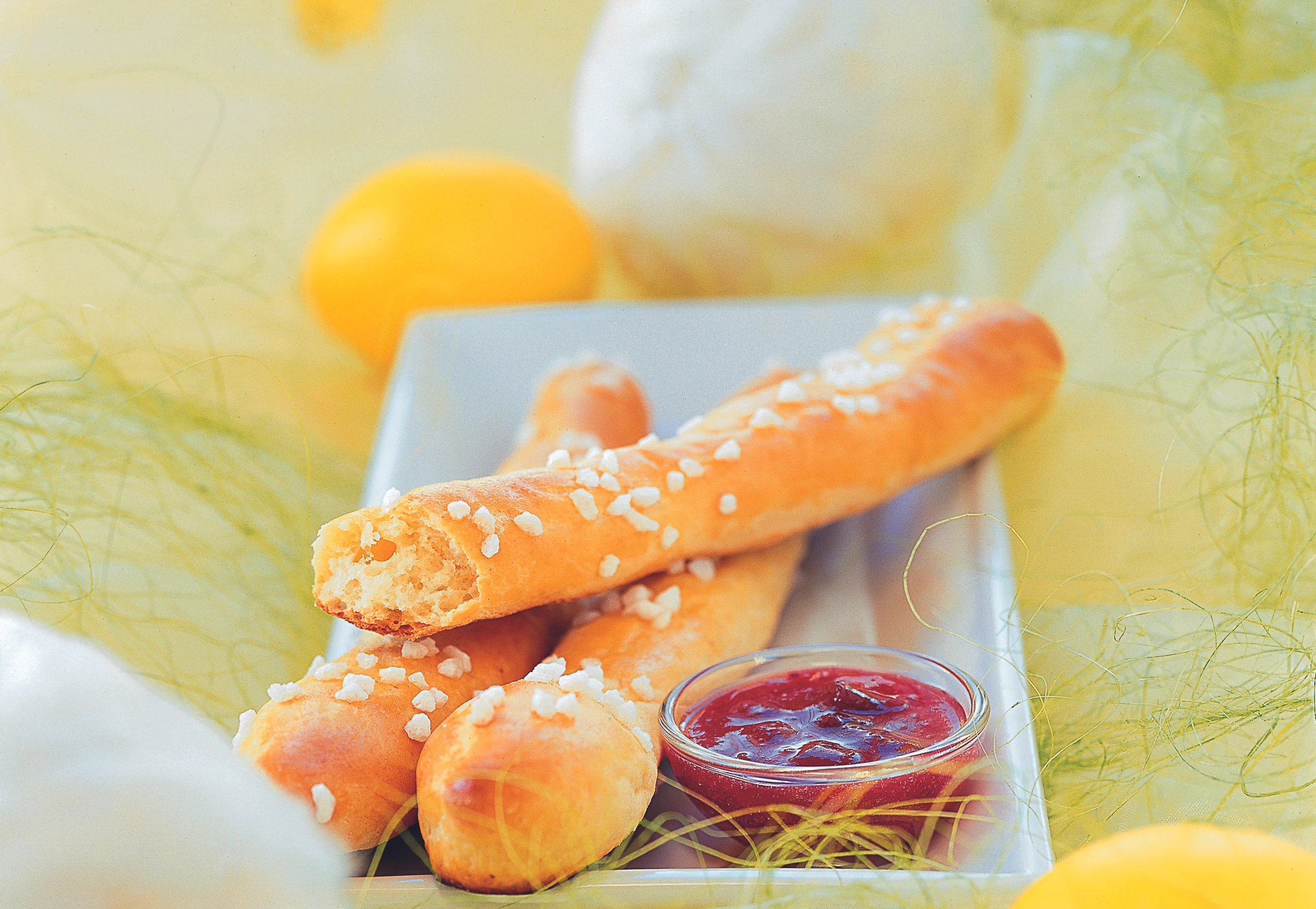 Erdäpfelstangerln mit Erdbeer-Rhabarber-Marmelade