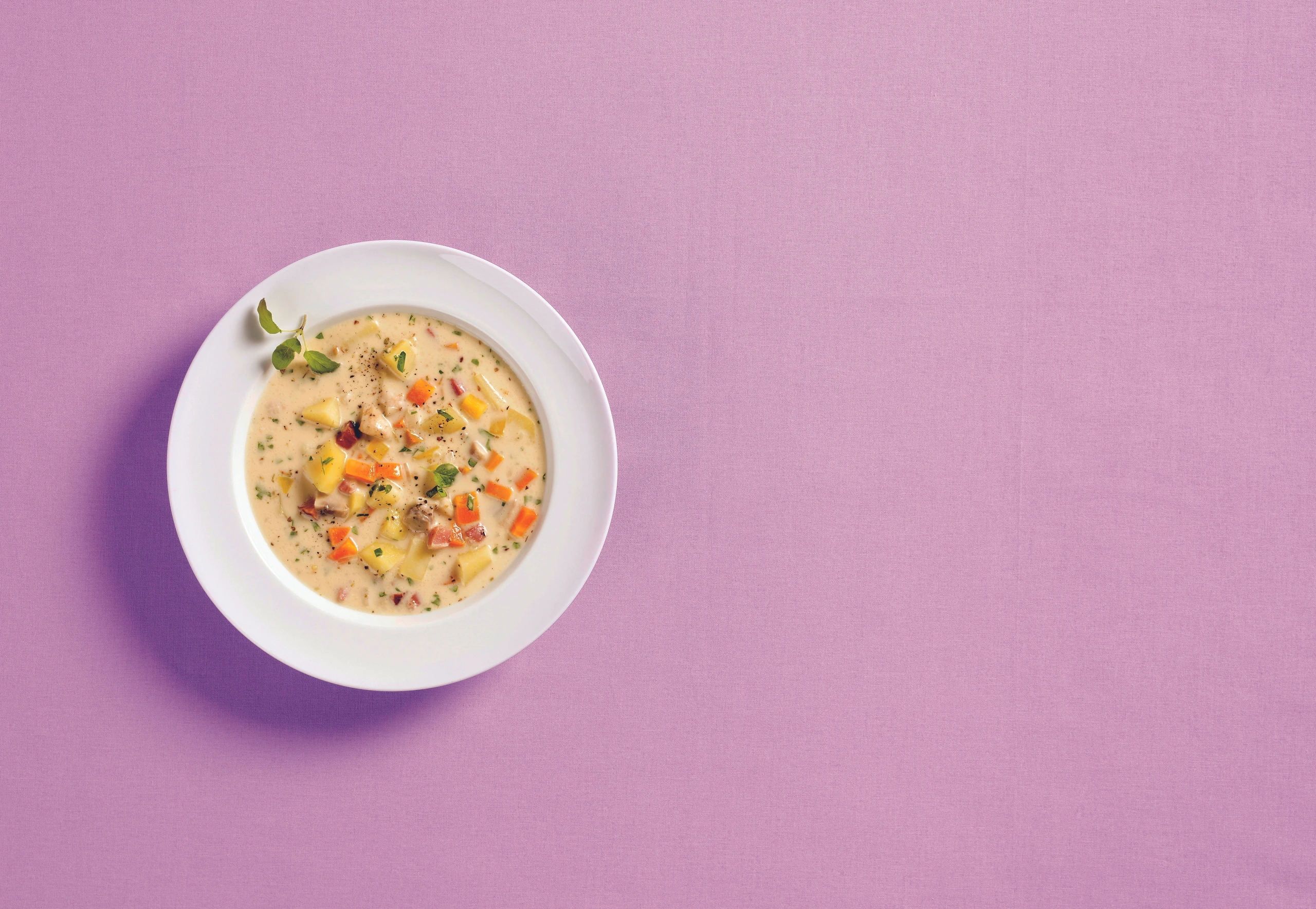 Champignons putzen, kurz waschen und in ca. 2 cm große Stücke schneiden. Erdäpfel, Karotten, Gelbe Rüben, Sellerie und Zwiebel schälen. Zwiebel und Speck kleinwürfelig, übriges Gemüse in ca. 1 cm große Würfel schneiden. Erdäpfelwürfel in kaltes Wasser legen.