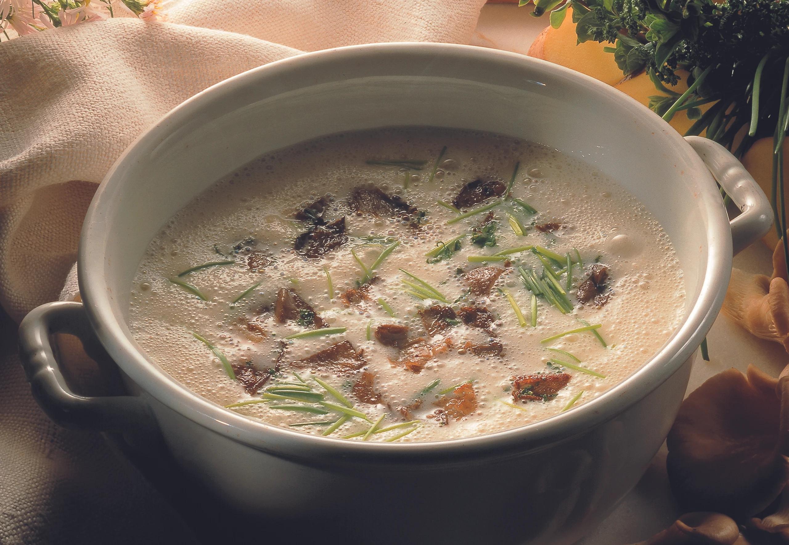 Restliches Obers aufschlagen. Vor dem Servieren der Suppe zugeben, Suppe nochmals aufmixen und in vorgewärmte Teller schöpfen. Pilze einlegen, Suppe mit Kräutern bestreut servieren.