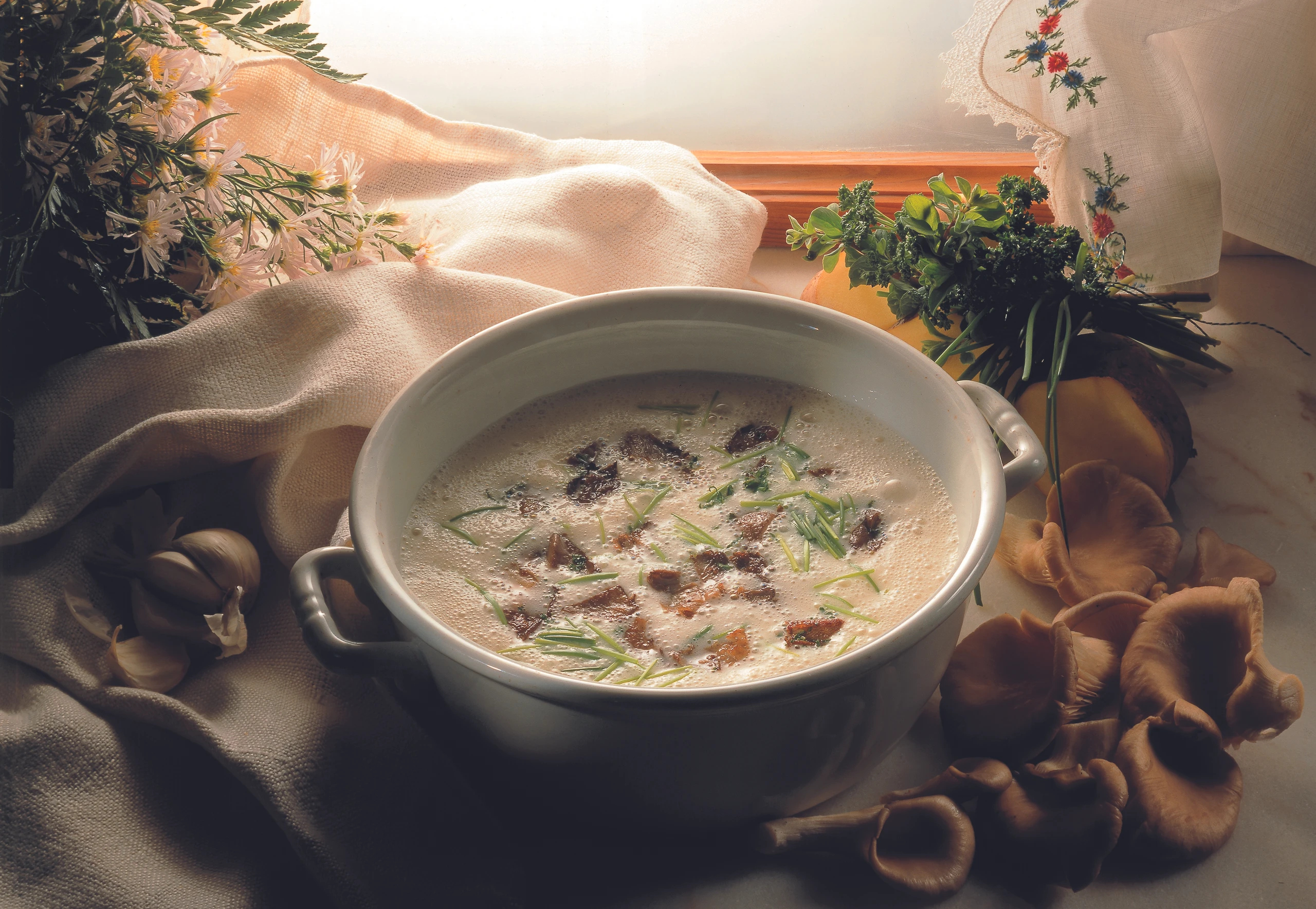 Erdäpfelsuppe mit Austernpilzen und Kräutern