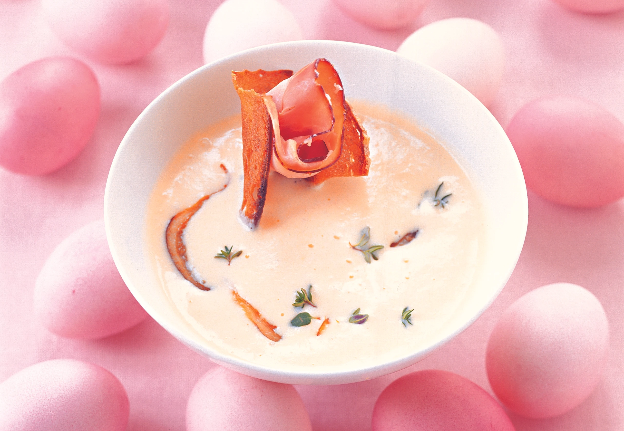 Brot in Öl knusprig braten, auf Küchenpapier abtropfen lassen und mit Schinken belegen. Suppe mit den Schinkenbroten anrichten und mit Kräuterblättchen garnieren.