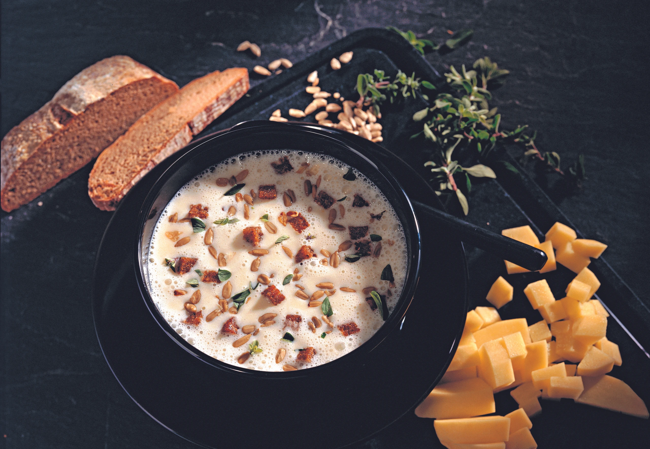 Während die Suppe kocht, Brot entrinden, kleinwürfelig schneiden und in heißem Öl unter Schwenken knusprig braten. Brotwürfel auf Küchenpapier gut abtropfen lassen.