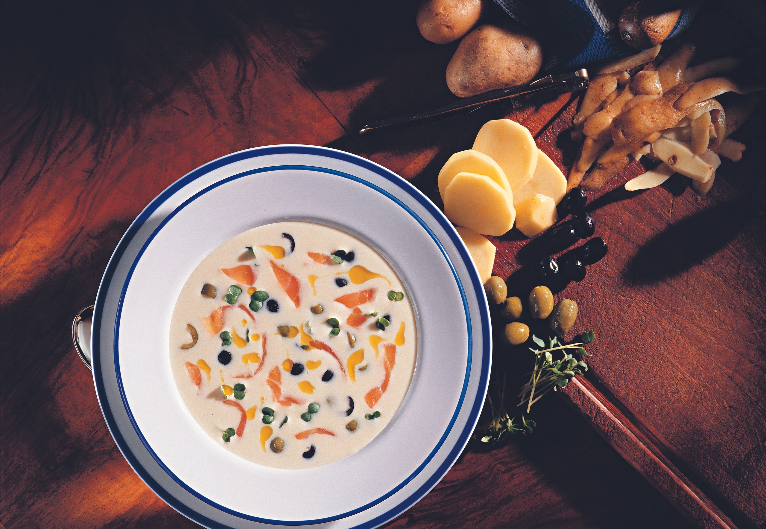 Erdäpfelsuppe mit Oliven und Räucherlachs