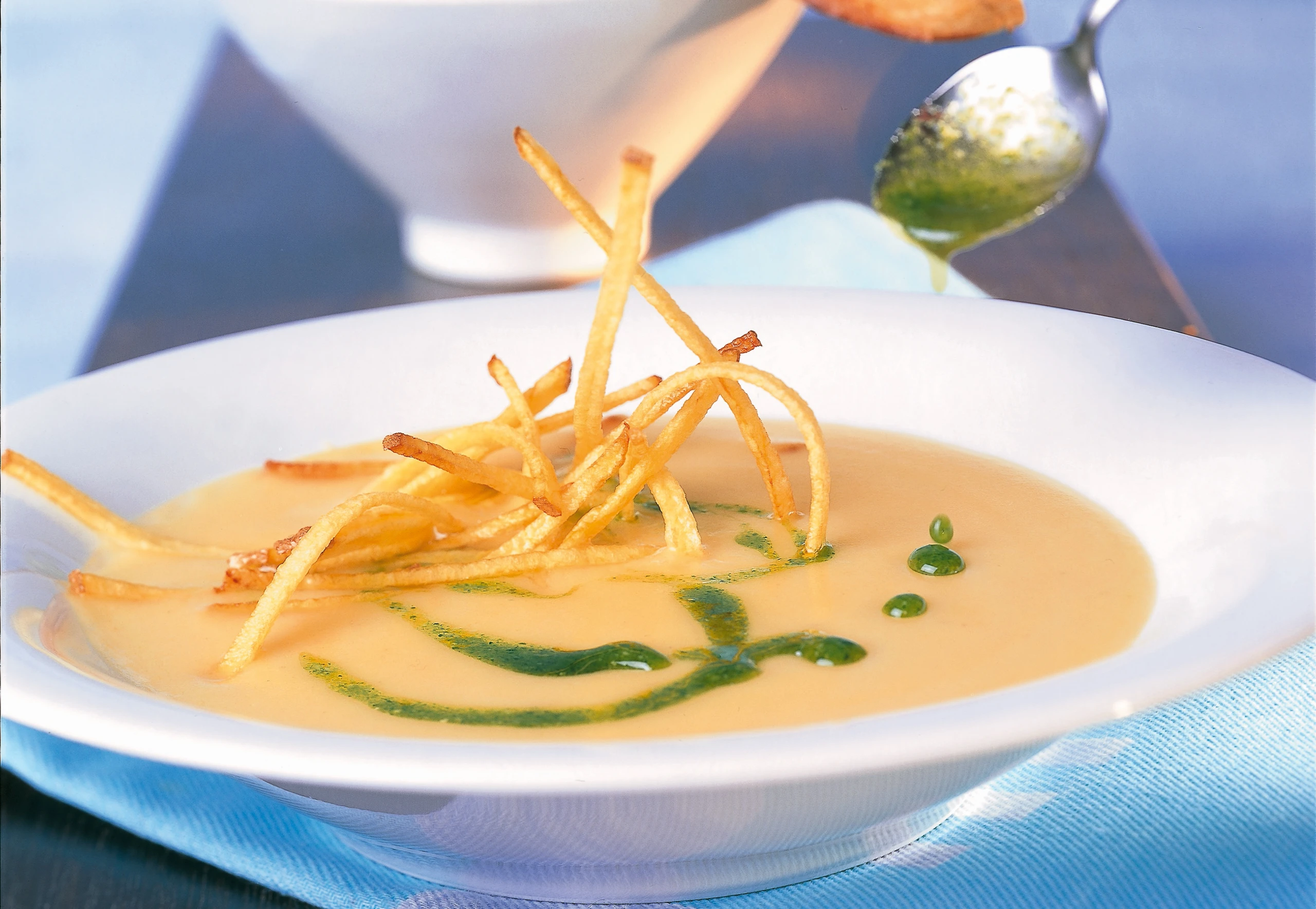Lorbeerblatt entfernen und die Suppe mit einem Stabmixer kurz pürieren. Suppe anrichten, mit Pesto und Erdäpfelstreifen garnieren.