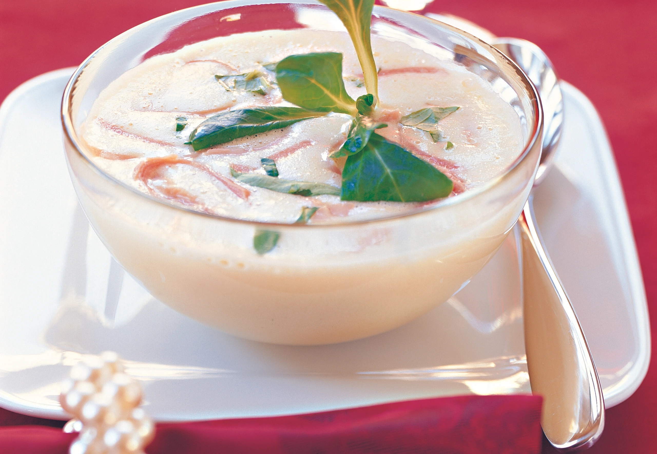 Obers in die Suppe gießen, aufkochen, mit Salz, Pfeffer und Muskat würzen. Suppe pürieren, mit Salat und Schinken verrühren.