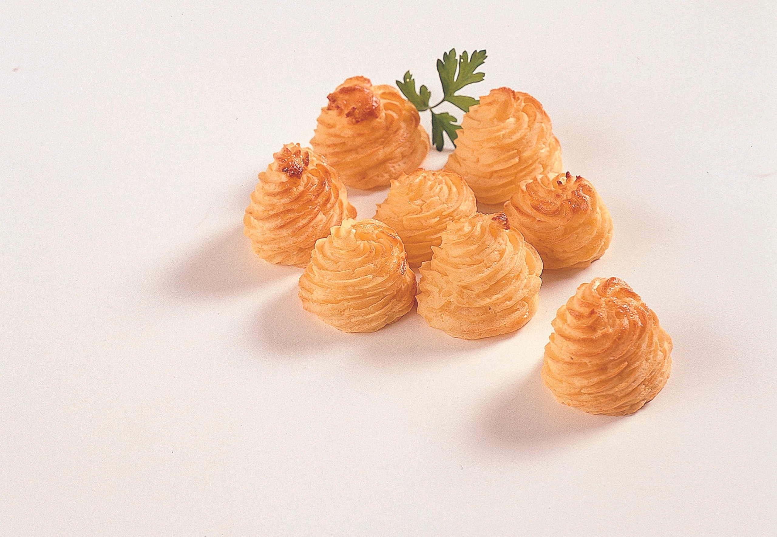 Erdäpfelmasse in einen Dressiersack (Sterntülle) füllen und 8 gleich große Krapferl auf das Blech dressieren.