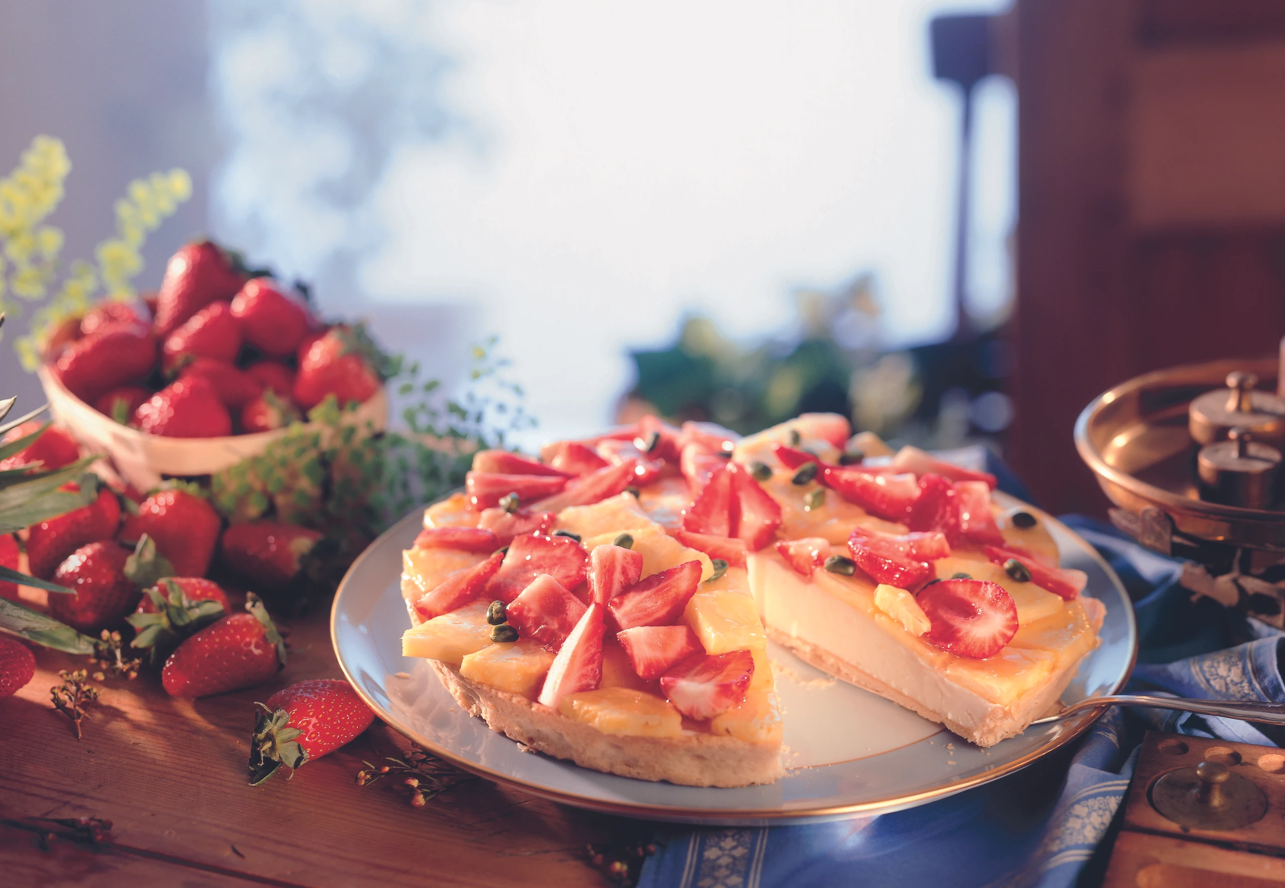 Ananas schälen, die braunen Vertiefungen mit einem spitzen Messer ausschneiden. Ananashälfte der Länge nach vierteln, Strunk wegschneiden, Fruchtfleisch quer in ca. 1/2 cm dicke Scheiben schneiden. Erdbeeren putzen, waschen und gut trockentupfen. Erdbeeren in beliebige Stücke oder dicke Scheiben schneiden. Torte mit den Früchten belegen.