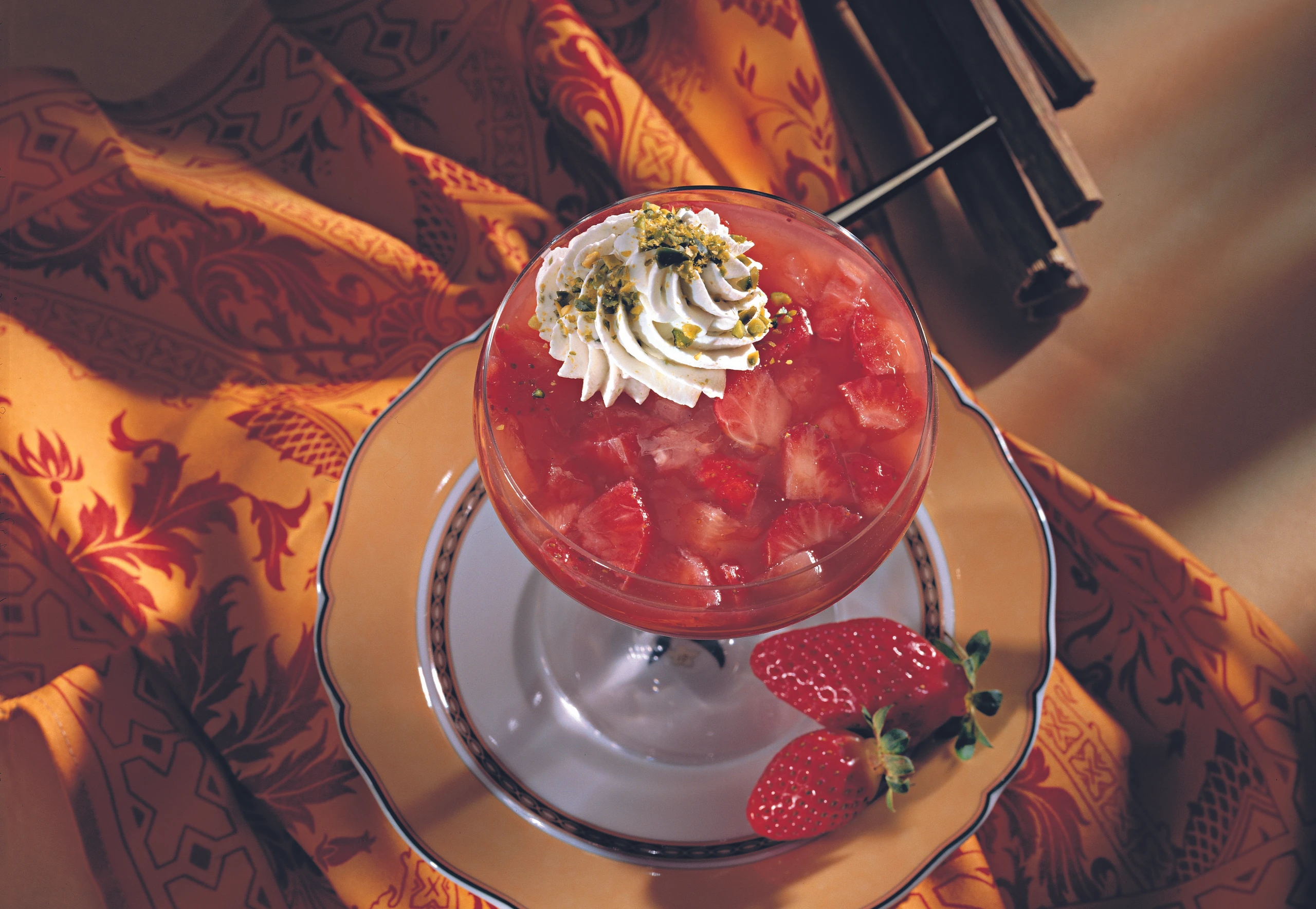 - 125 ml Schlagobers mit 1 TL Staubzucker und 1 EL gehackten Pistazien verrühren und dickcremig schlagen. Obers in einen Dressiersack füllen und die Gelees damit garnieren. Mit gehackten Pistazien bestreuen.