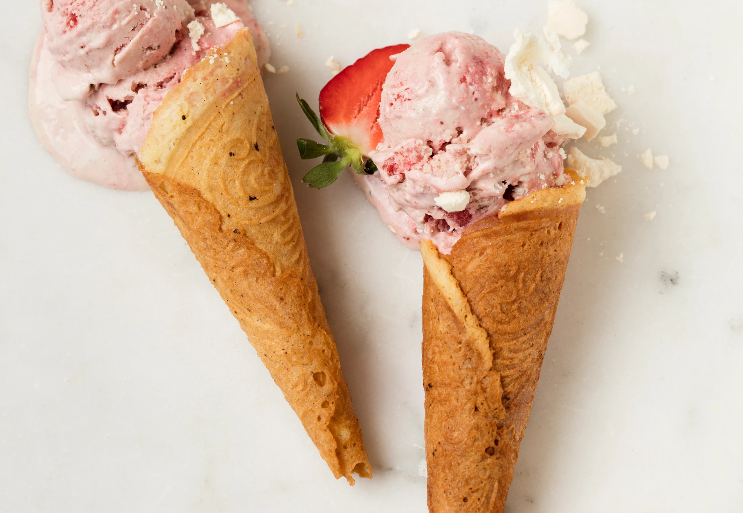 Erdbeereis in Gläser oder Tüten portionieren und mit übrigem Baiser garnieren.