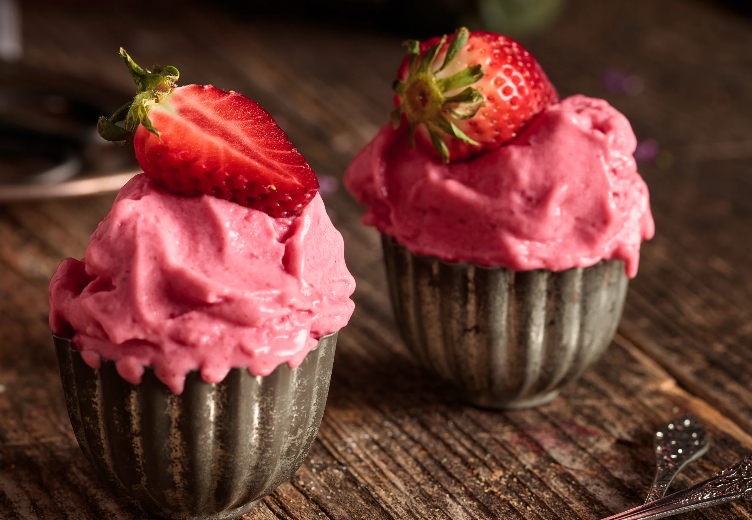 Obst und Honig pürieren. Eis sofort mit den frischen Erdbeeren servieren.