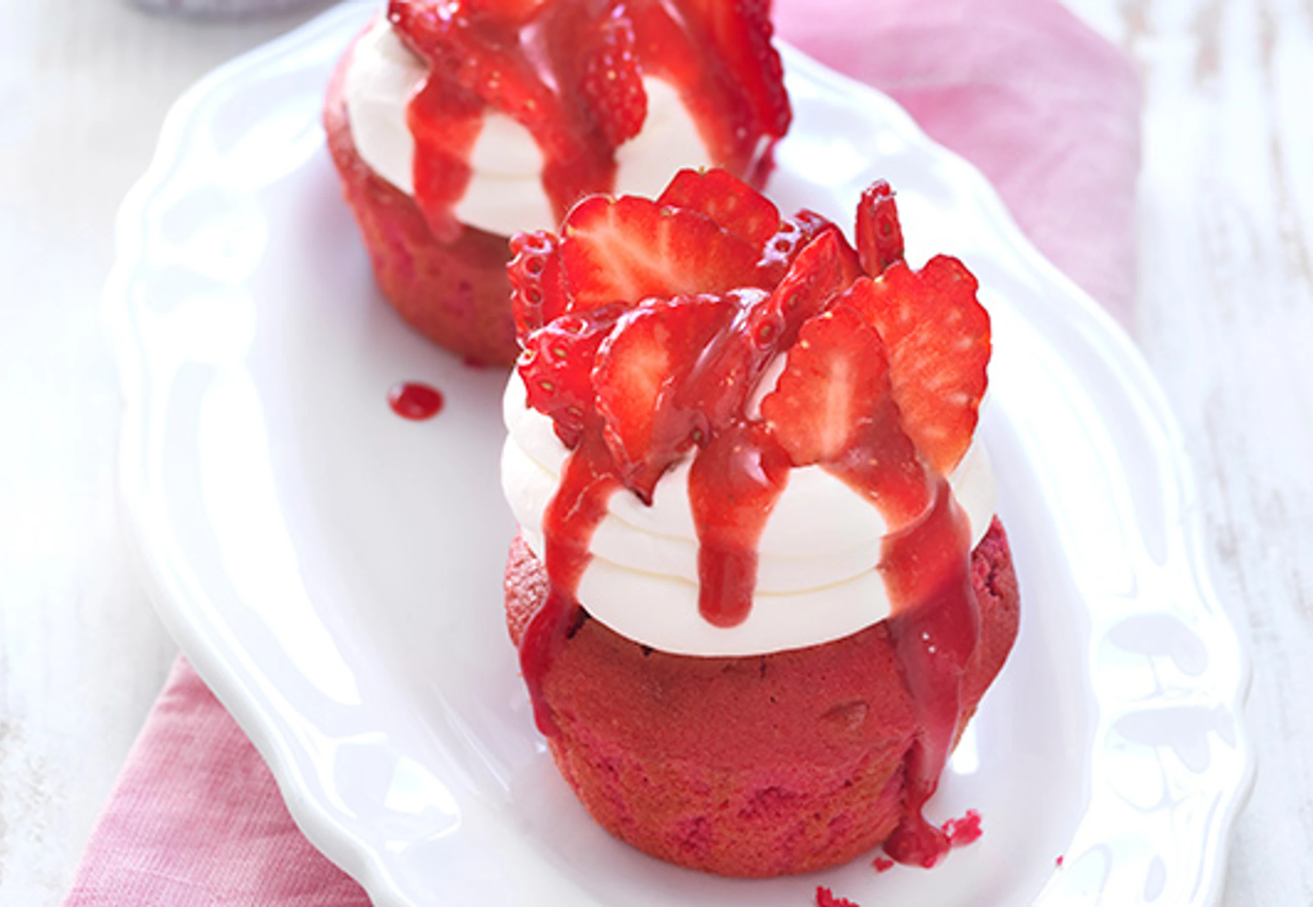 Für das Topping Mascarpone, Topfen und Zucker verrühren. Obers schlagen und unterheben. Creme in einen Dressiersack füllen (glatte Tülle) und auf die Muffins dressieren. Cupcakes mit Erdbeersauce und -stücken garnieren.