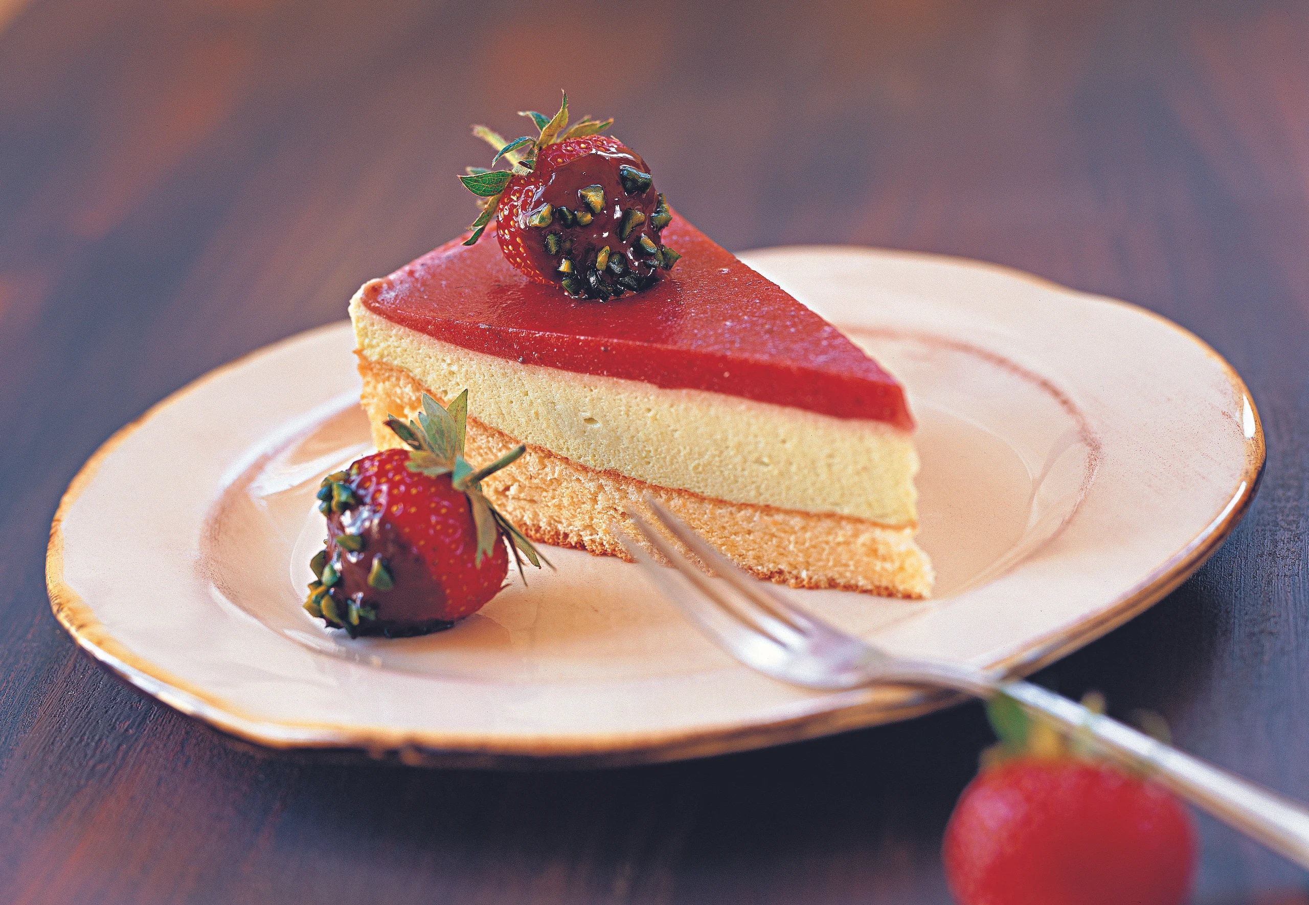 Torte aus der Form lösen und mit den getunkten Erdbeeren garnieren.