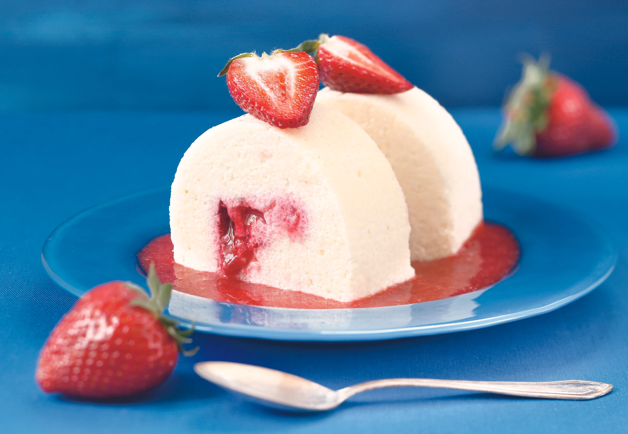 - Flammeri aus der Form stürzen, Folie abziehen. Flammeri in Scheiben schneiden und mit übriger Erdbeersauce servieren.