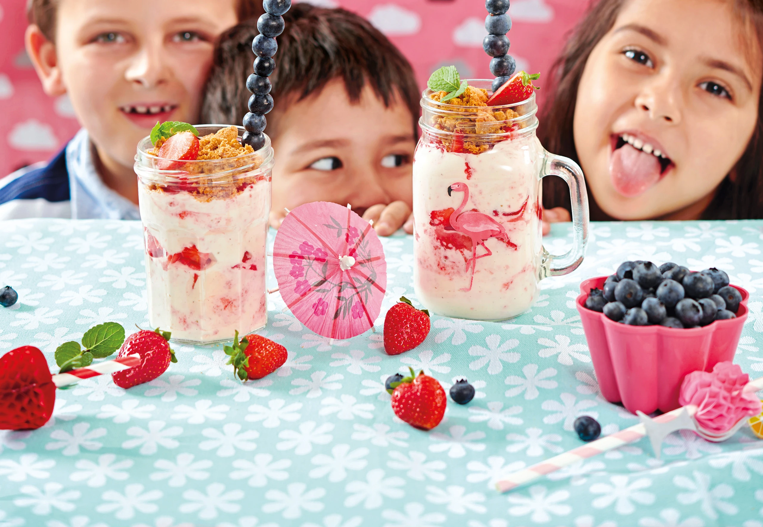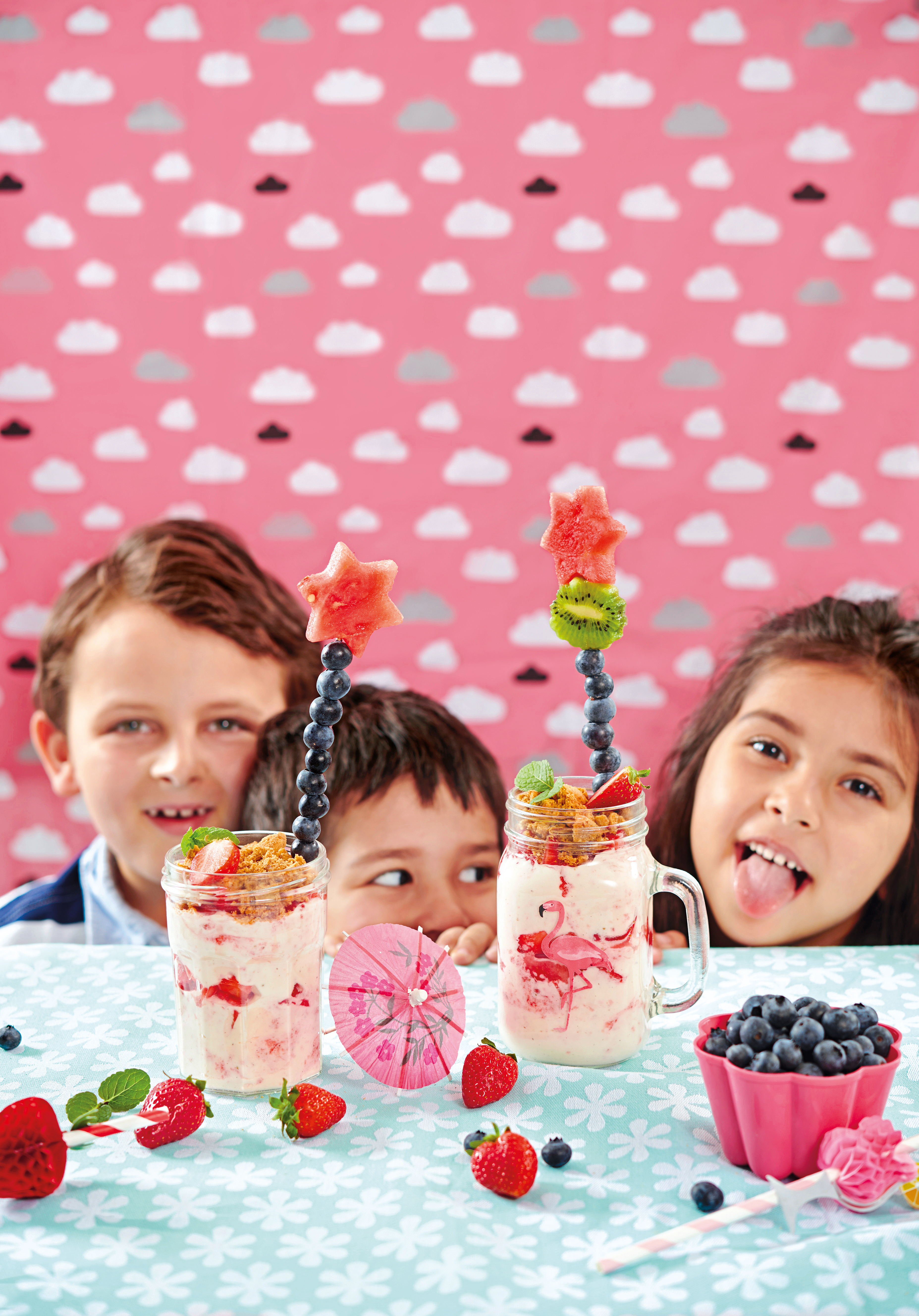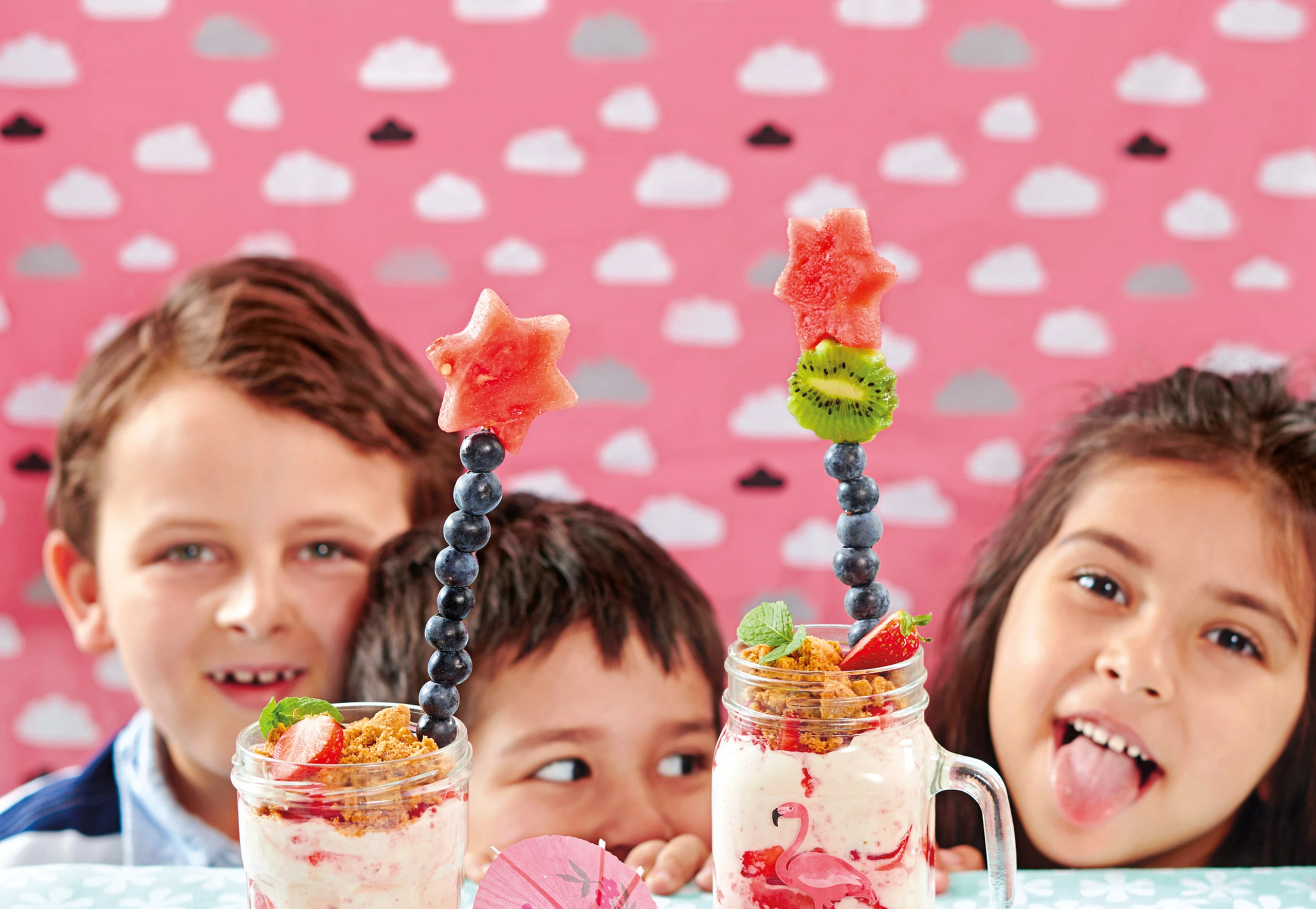 Kekse zerbröseln und in den Gläsern verteilen. Trifles mit den kleinen Erdbeeren dekorieren und mit den Obst-Zauberstäben servieren.