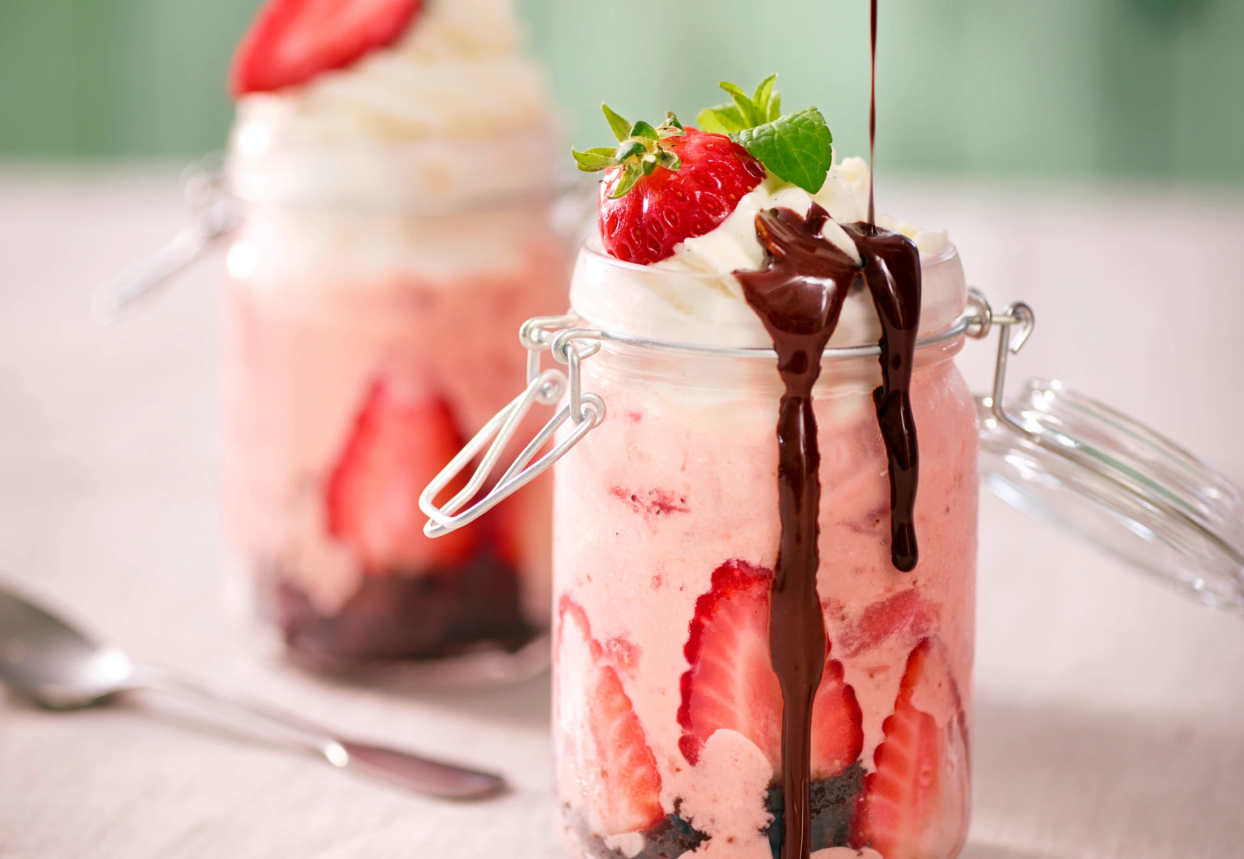 Browniebrösel in 8 Gläser füllen, Erdbeerscheiben einschichten, Eis darauf verteilen. Obers aufdressieren, mit Erdbeerhälften und Minze garnieren, Schokosauce darüber träufeln.