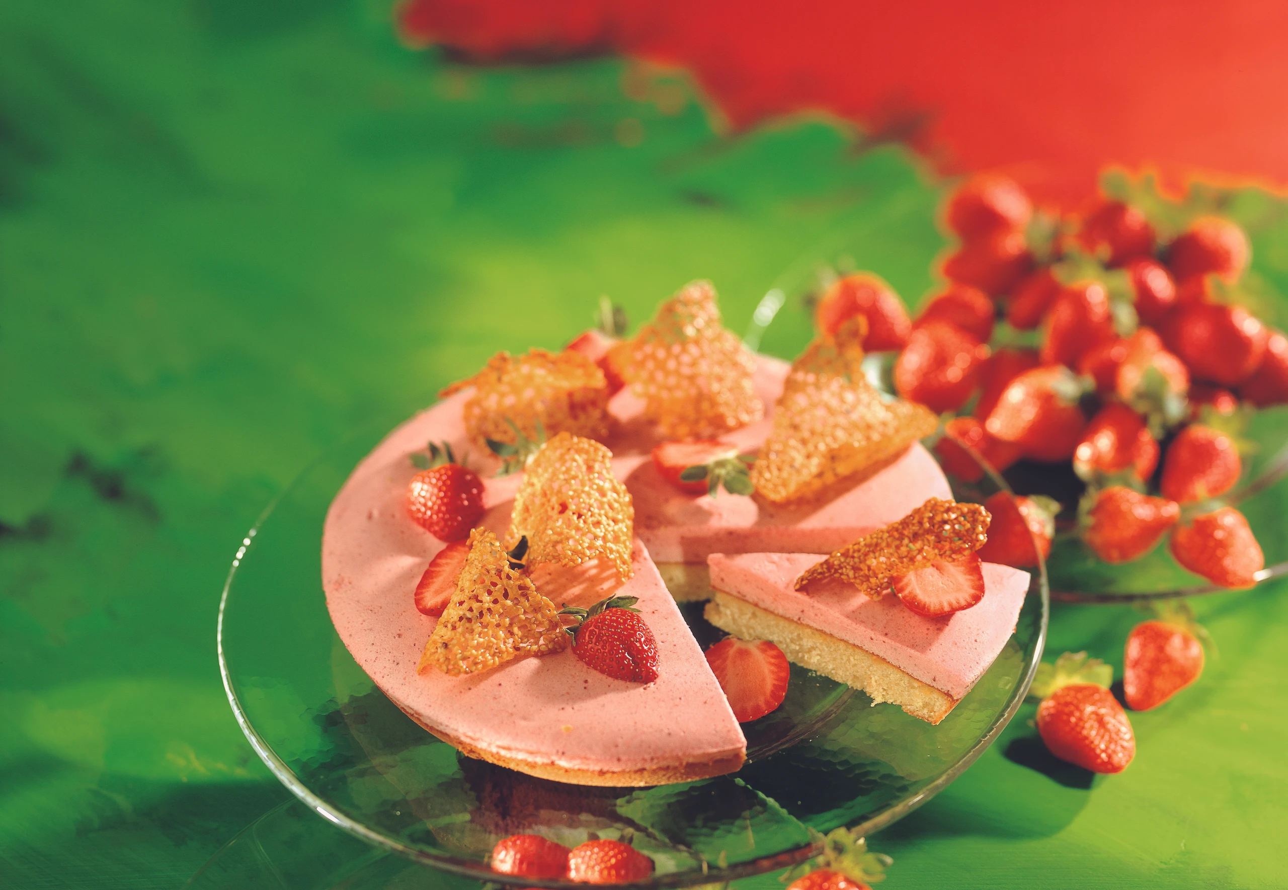 Tarte aus dem Kühlschrank nehmen. Erdbeeren der Länge nach halbieren. Tarte mit den Erdbeerhälften und Sesamhippen (siehe Rezept) garnieren.