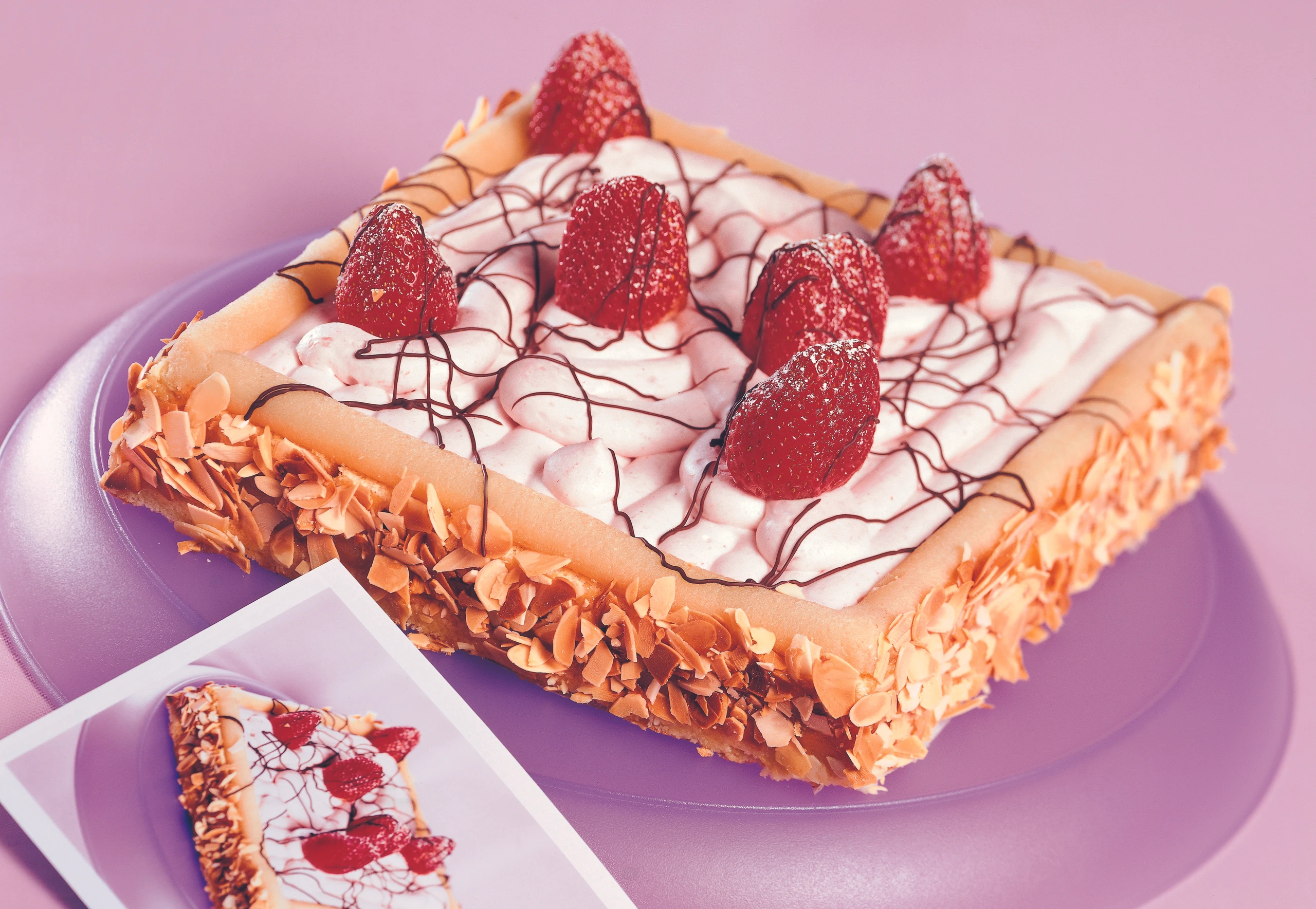 Tortenränder rundum mit Marmelade bestreichen und mit Mandelblättchen bestreuen. Oberfläche mit Erdbeeren und geschmolzener Schokolade verzieren. Torte vor dem Servieren 3–4 Stunden kühlen.