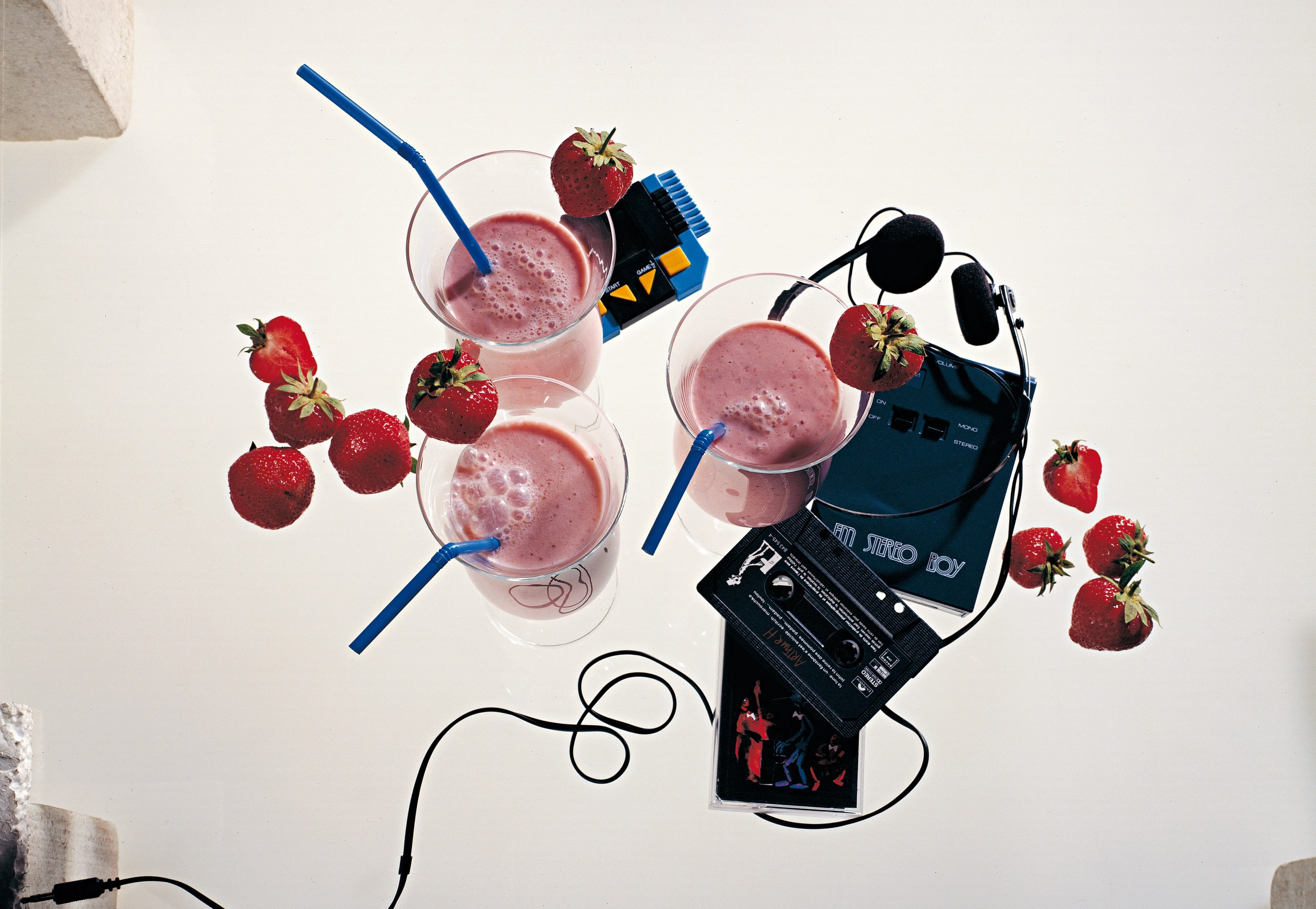 Für die Dekoration die Erbeeren an den Spitzen ein wenig einschneiden und auf die Gläser stecken. Ersatzweise kann man die Milchshakes mit Kiwischeiben garnieren.