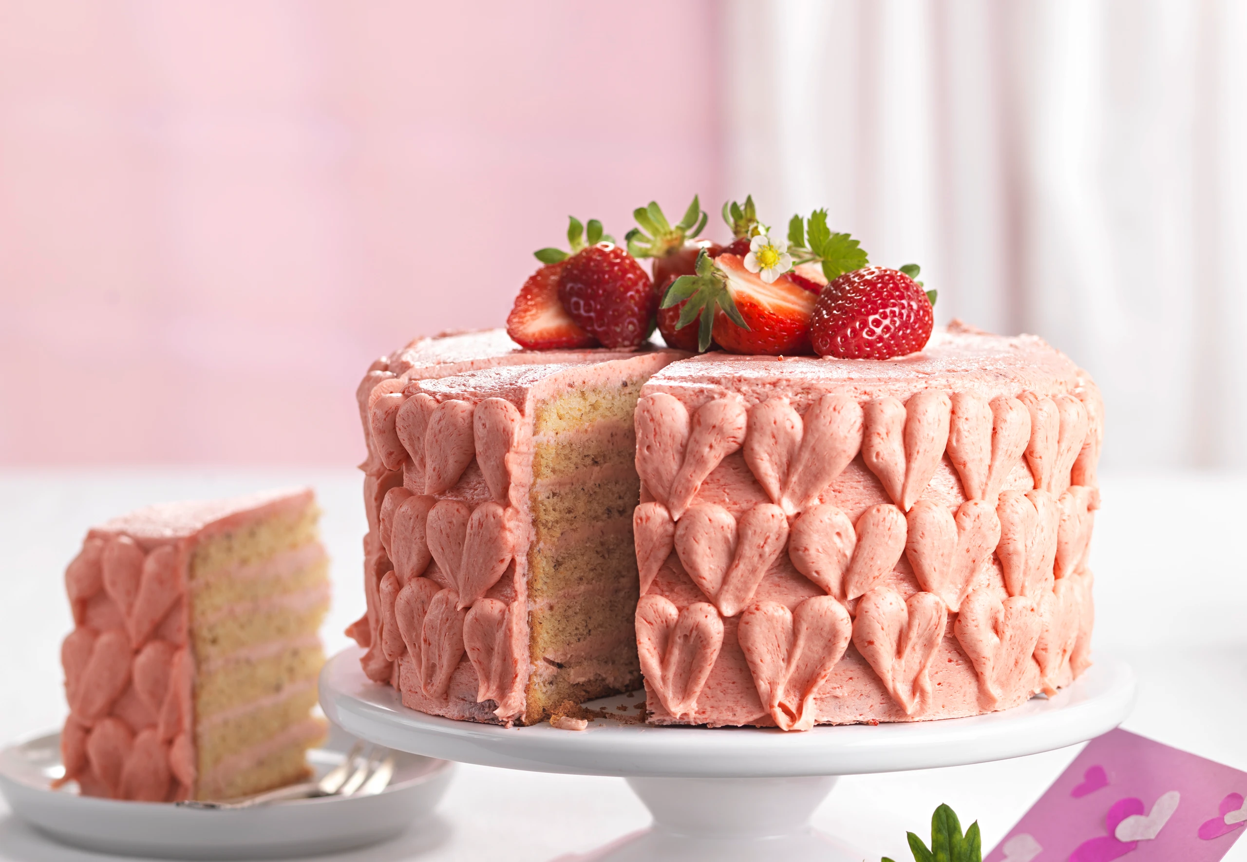Torte aus der Form stürzen und 5 Mal durchschneiden. Die Hälfte von der Creme auf 5 von den Böden verstreichen, Böden zusammensetzen, übrigen Boden darauf legen und behutsam andrücken. Torte mit der Hälfte von der übrigen Creme rundum einstreichen. Übrige Creme in einen Dressiersack (glatte Tülle) füllen und Tupfer auf die Torte spritzen. Auf die Cremetupfer mit einer Palette ein Herzmuster aufdrücken. Torte für mindestens 3 Stunden kühl stellen.