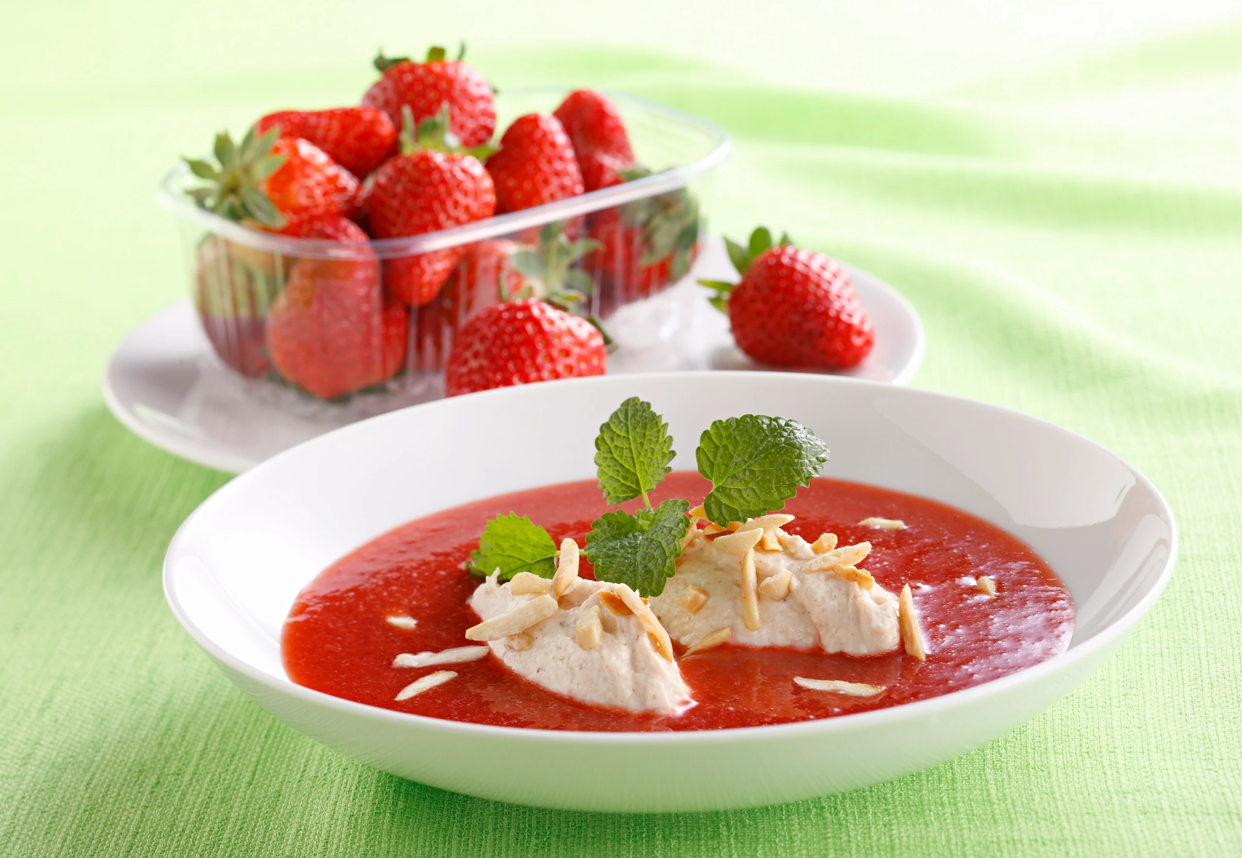 - Erdbeer-Orangen-Suppe in tiefen Tellern anrichten. Aus der Topfenmasse mit 2 Löffeln Nockerln abstechen. Nockerln in die Suppe setzen, mit gerösteten Mandeln und evtl. Minze bestreuen.
